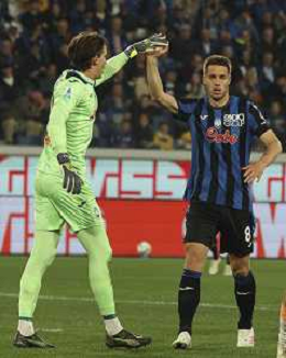 Marco Carnesecchi of Atalanta BC change hight five with Mario Pasalic of Atalanta BC during Atalanta BC vs AS Roma, 36° Serie A Enilive 2024-25 game at Gewiss stadium in Bergamo (BG), Italy, on May 12, 2025. (Photo by Davide Casentini)- AGENZIA ALDO LIVERANI SAS