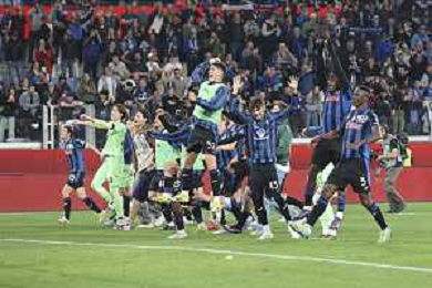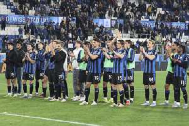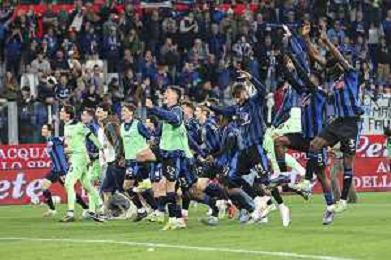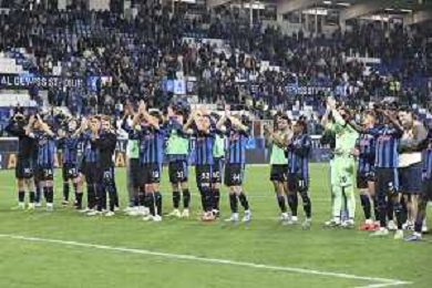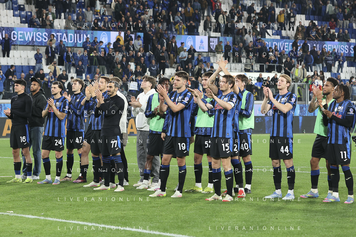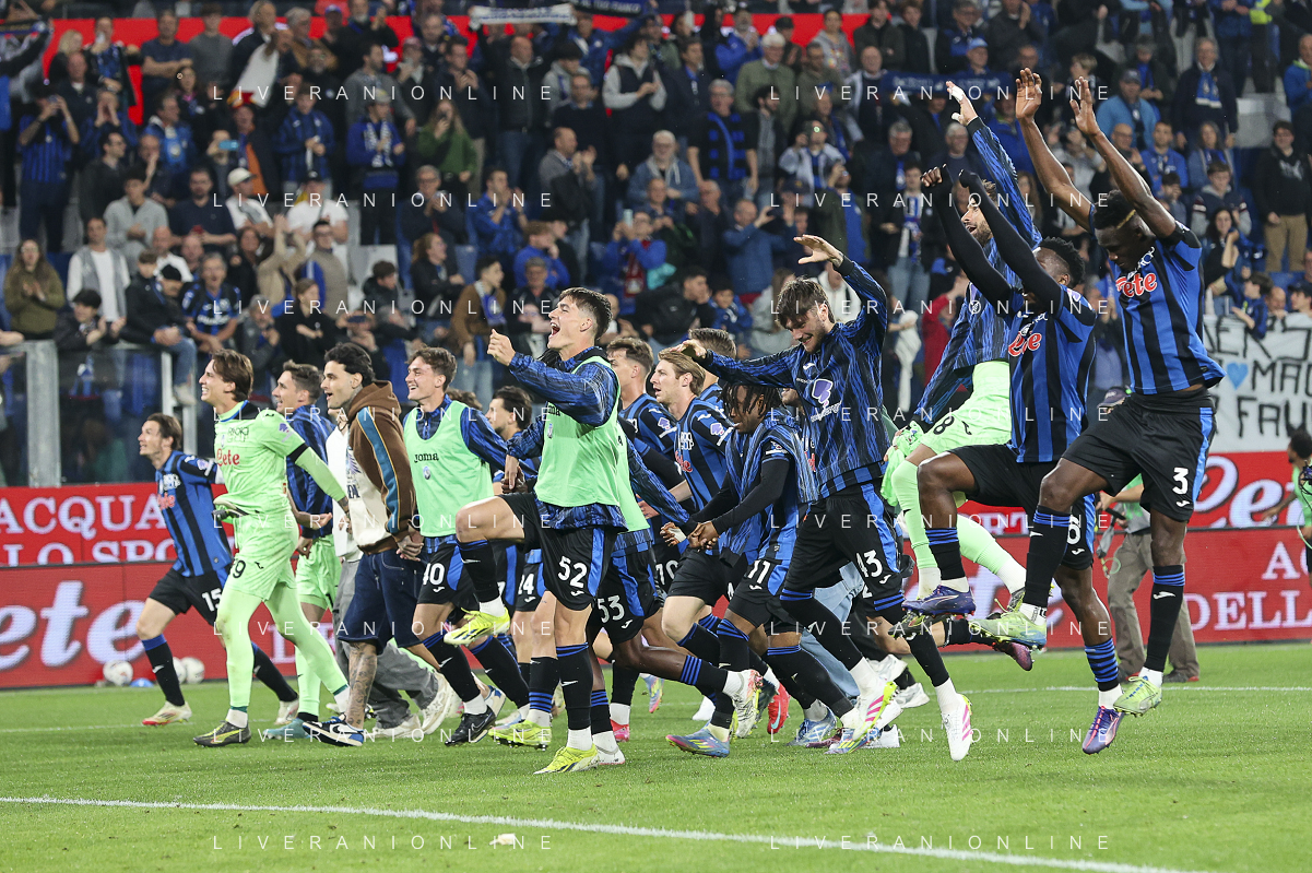 Atalanta BC players celebrate the victory at the end of Atalanta BC vs AS Roma, 36° Serie A Enilive 2024-25 game at Gewiss stadium in Bergamo (BG), Italy, on May 12, 2025. (Photo by Davide Casentini)- AGENZIA ALDO LIVERANI SAS
