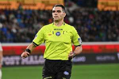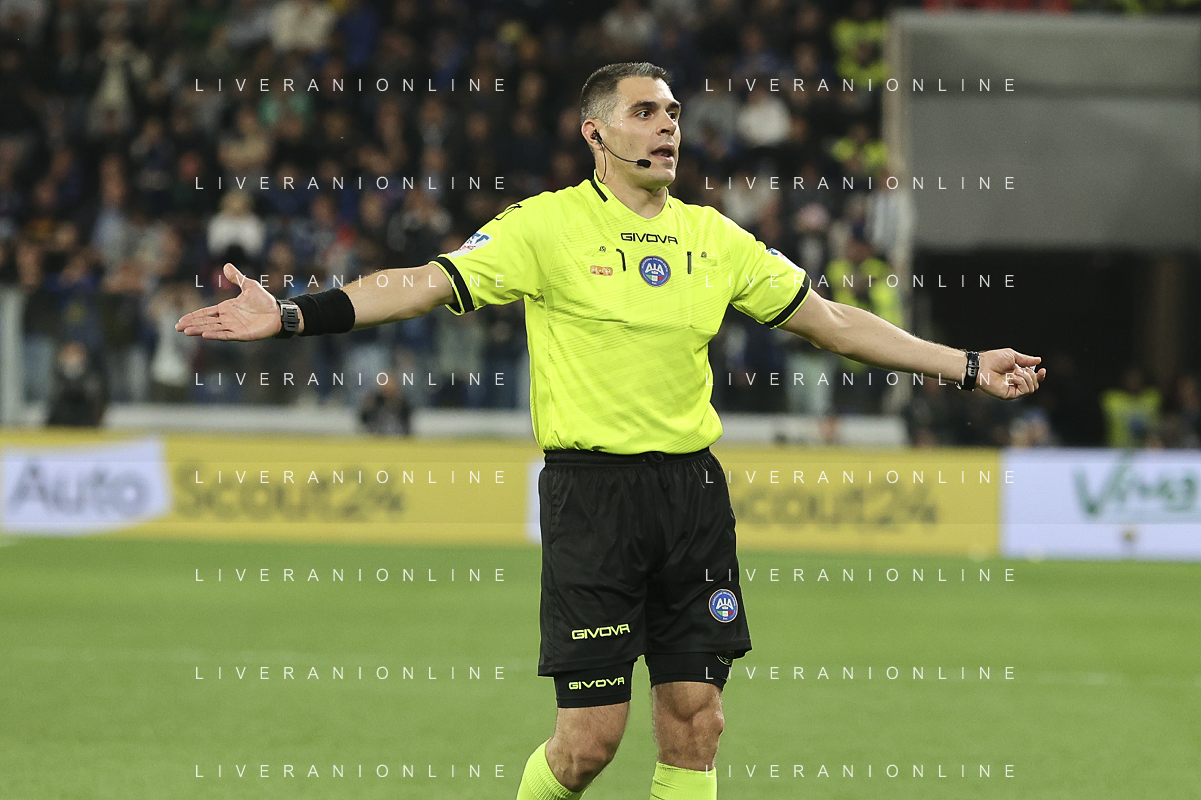 Arbitro - the Referee Simone Sozza gestures during Atalanta BC vs AS Roma, 36° Serie A Enilive 2024-25 game at Gewiss stadium in Bergamo (BG), Italy, on May 12, 2025. (Photo by Davide Casentini)- AGENZIA ALDO LIVERANI SAS