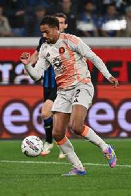 Devyne Rensch of AS Roma play the ball during Atalanta BC vs AS Roma, 36° Serie A Enilive 2024-25 game at Gewiss stadium in Bergamo (BG), Italy, on May 12, 2025. (Photo by Davide Casentini)- AGENZIA ALDO LIVERANI SAS