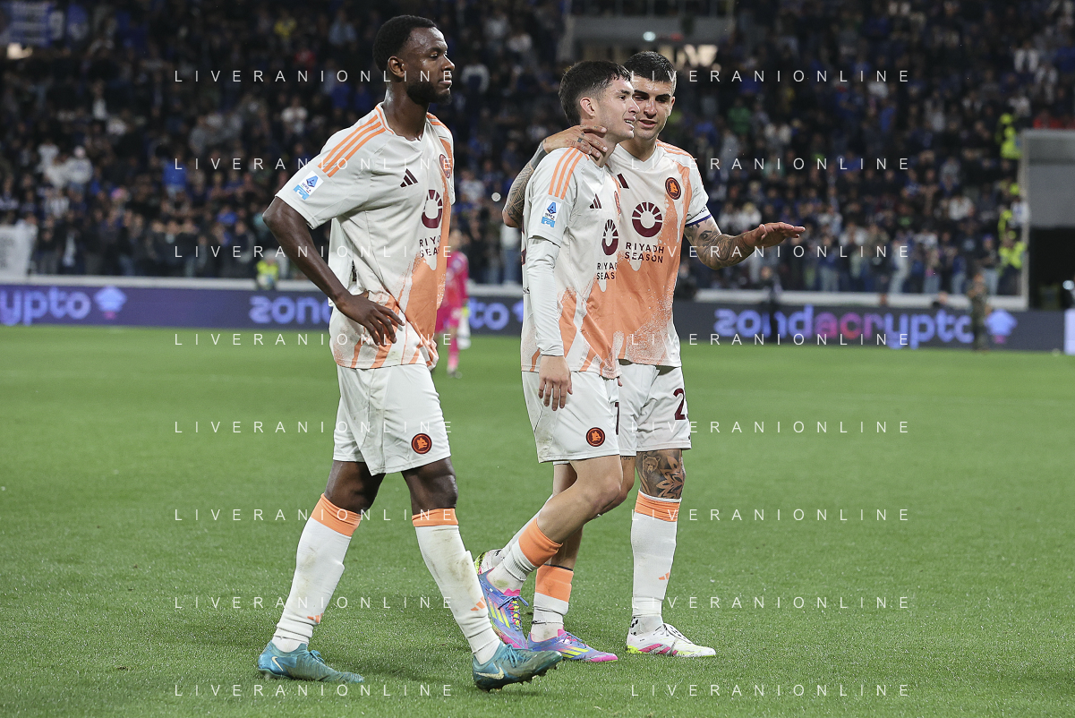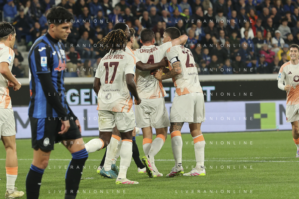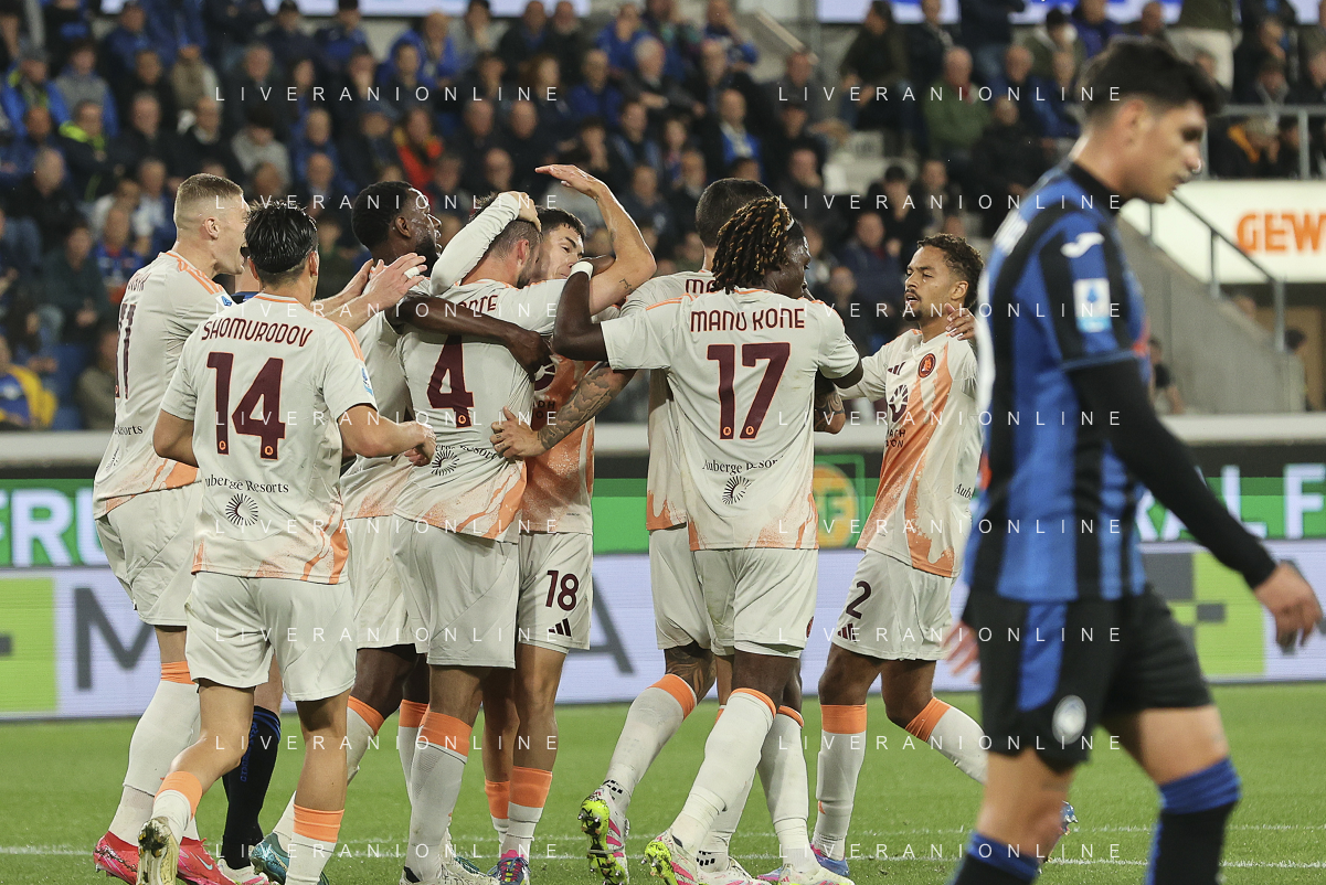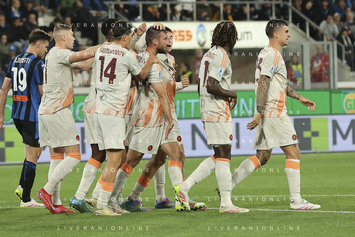 Bryan Cristante of AS Roma celebrates with team after goal during Atalanta BC vs AS Roma, 36° Serie A Enilive 2024-25 game at Gewiss stadium in Bergamo (BG), Italy, on May 12, 2025. (Photo by Davide Casentini)- AGENZIA ALDO LIVERANI SAS