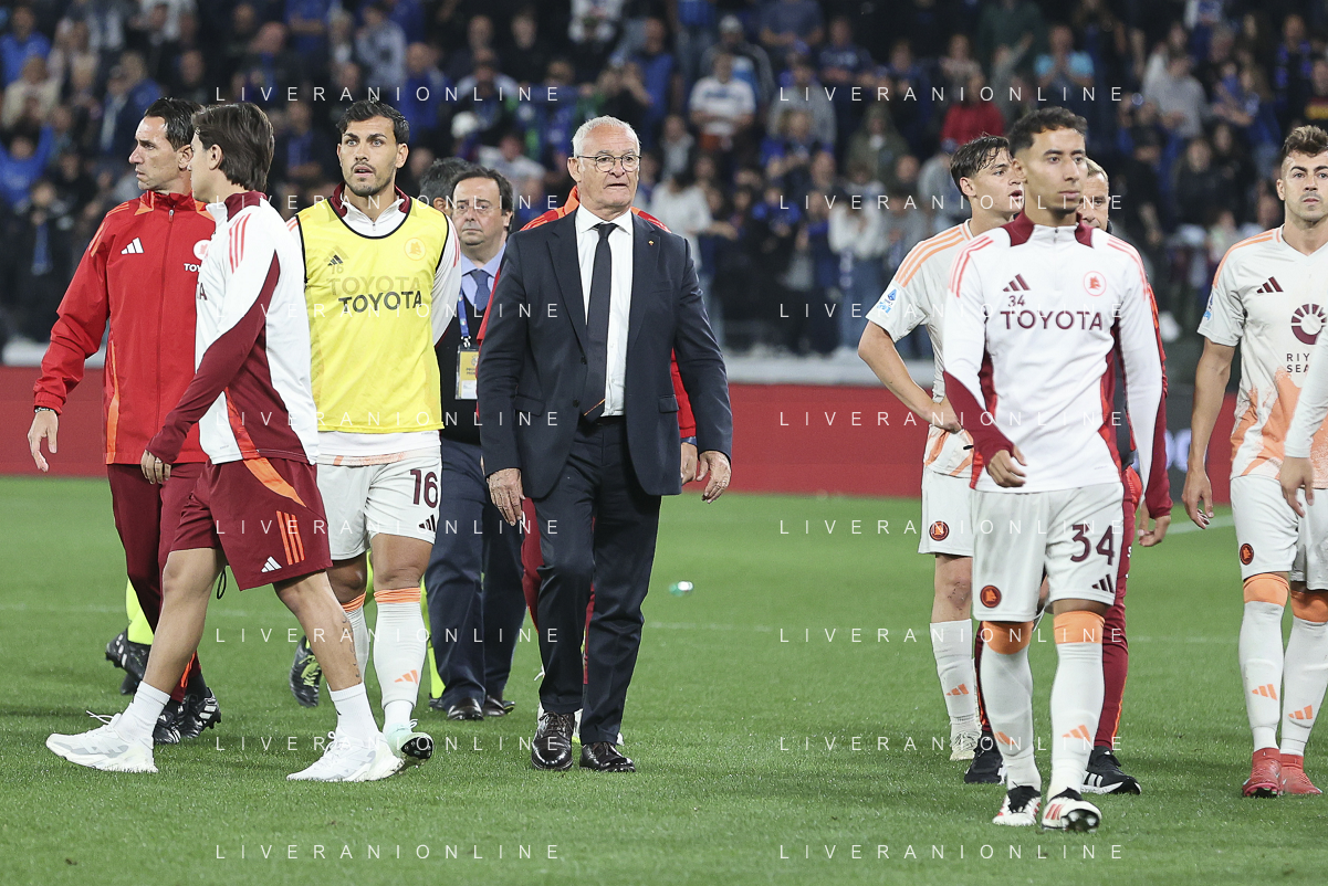 Claudio Ranieri Head Coach of AS Roma and Roma players expresses disappointment at the end of Atalanta BC vs AS Roma, 36° Serie A Enilive 2024-25 game at Gewiss stadium in Bergamo (BG), Italy, on May 12, 2025. (Photo by Davide Casentini)- AGENZIA ALDO LIVERANI SAS