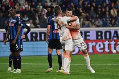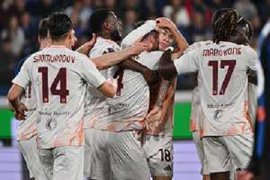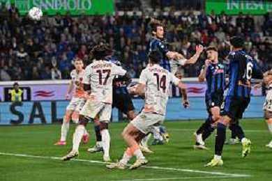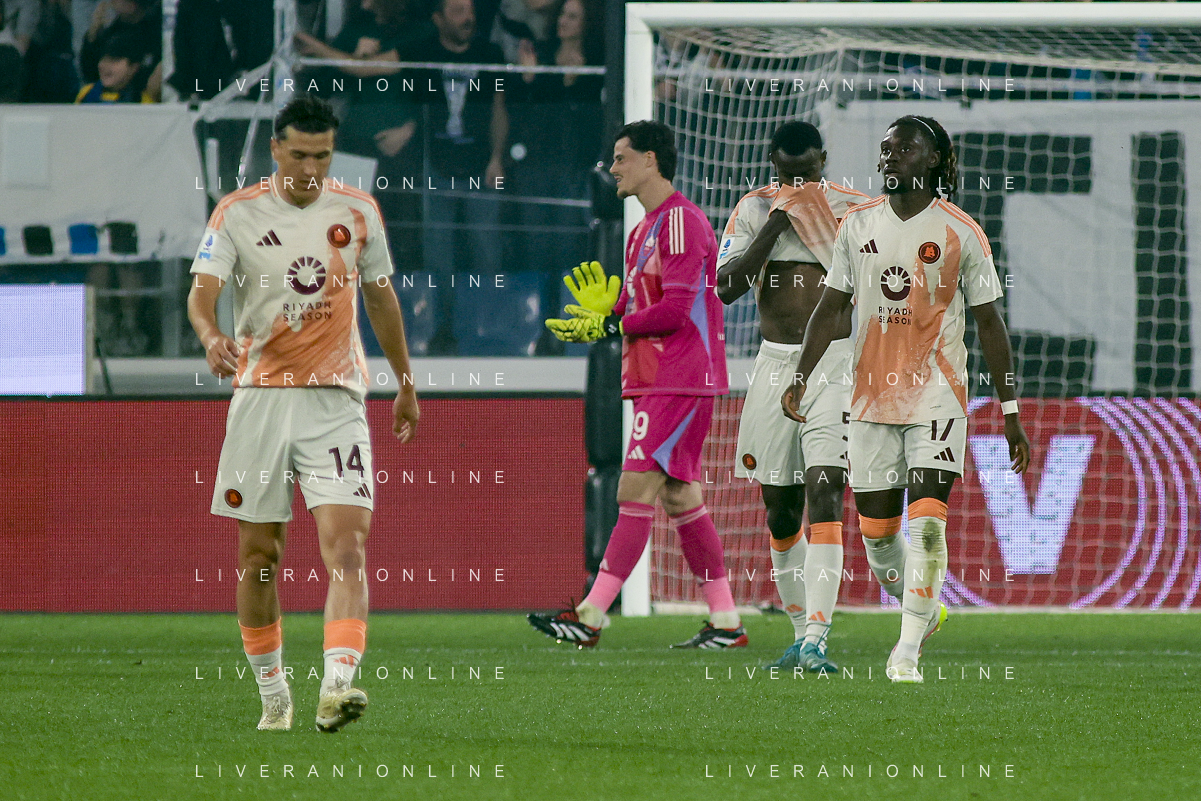 Roma players expresses disappointment after Ademola Lookman of Atalanta BC goal during Atalanta BC vs AS Roma, 36° Serie A Enilive 2024-25 game at Gewiss stadium in Bergamo (BG), Italy, on May 12, 2025. (Photo by Davide Casentini)- AGENZIA ALDO LIVERANI SAS