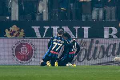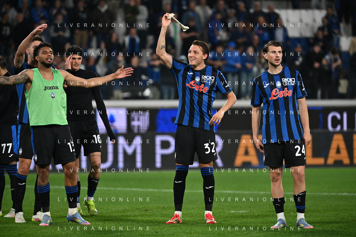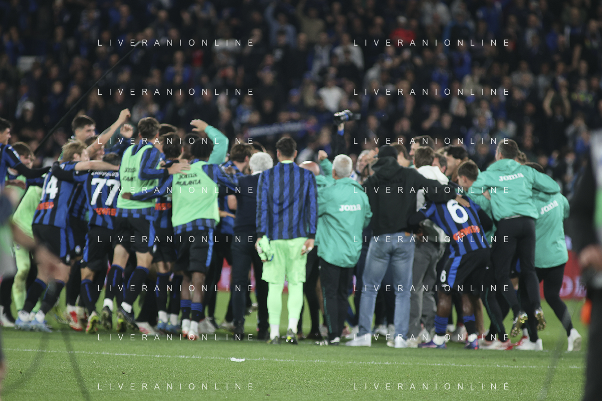 Atalanta BC players celebrate the victory at the end of Atalanta BC vs AS Roma, 36° Serie A Enilive 2024-25 game at Gewiss stadium in Bergamo (BG), Italy, on May 12, 2025. (Photo by Davide Casentini)- AGENZIA ALDO LIVERANI SAS