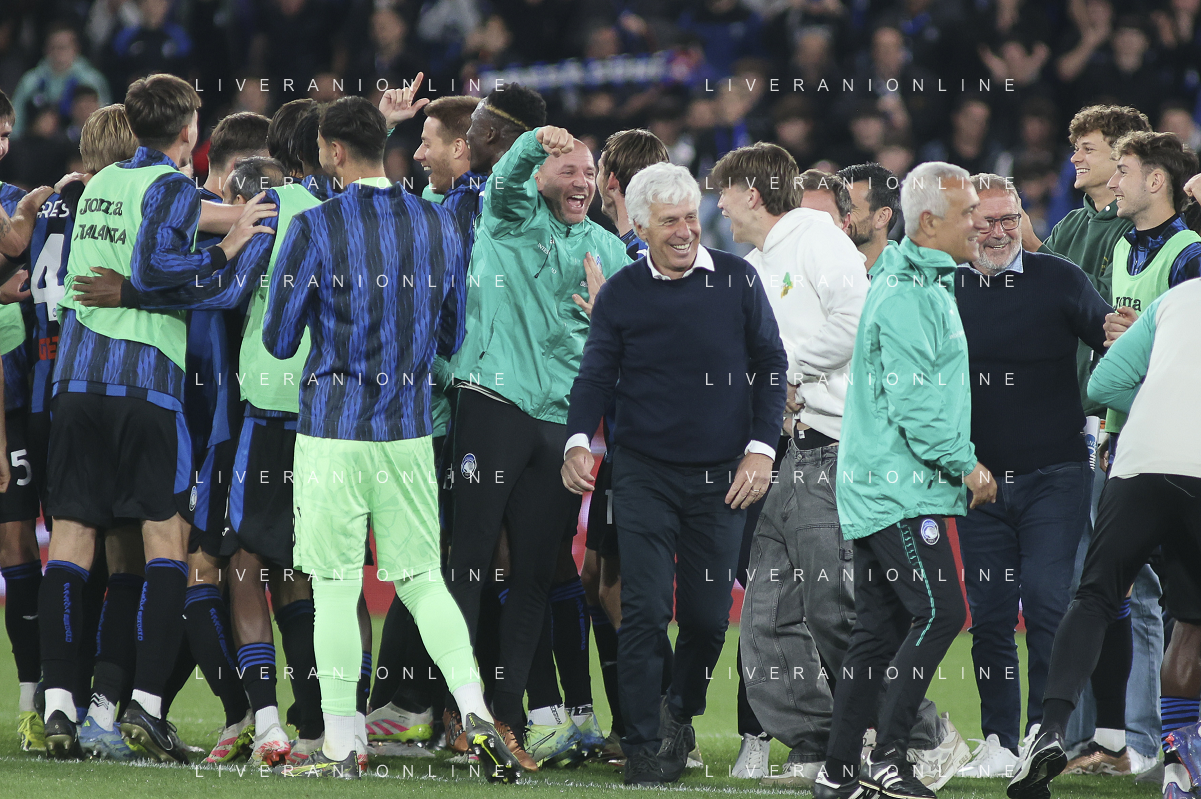 Atalanta BC players and Gian Piero Gasperini Head Coach of Atalanta BC celebrate the victory at the end of Atalanta BC vs AS Roma, 36° Serie A Enilive 2024-25 game at Gewiss stadium in Bergamo (BG), Italy, on May 12, 2025. (Photo by Davide Casentini)- AGENZIA ALDO LIVERANI SAS