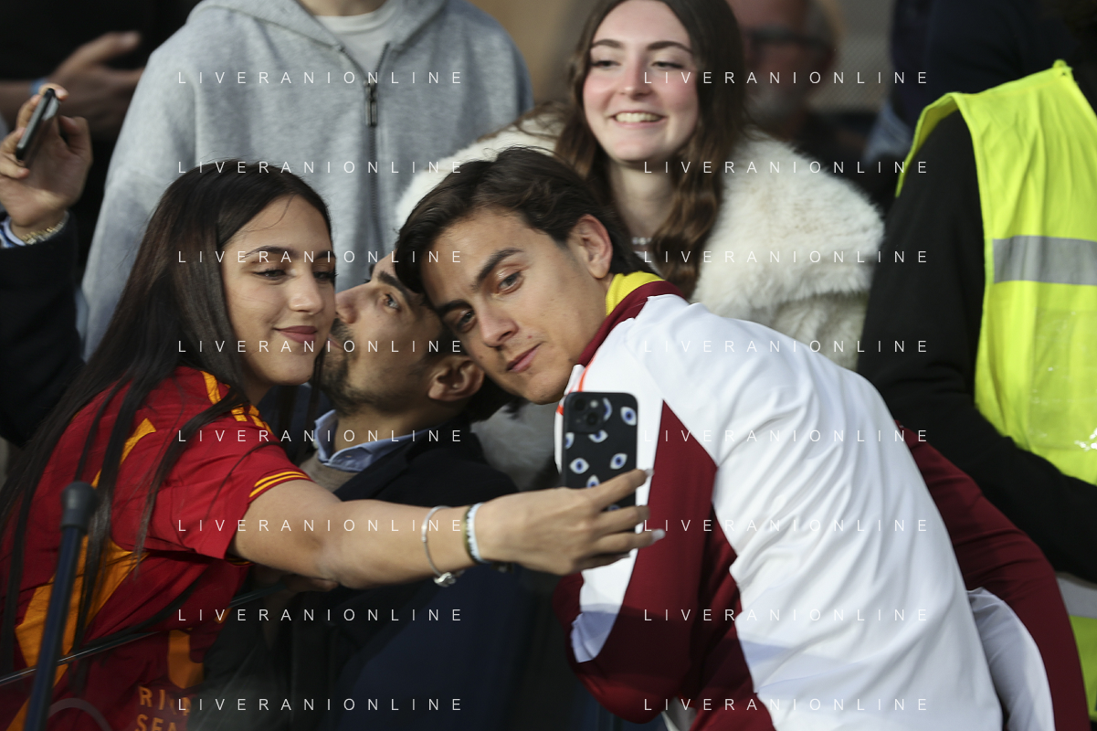 Paulo Dybala of AS Roma selfie with fans before start Atalanta BC vs AS Roma, 36° Serie A Enilive 2024-25 game at Gewiss stadium in Bergamo (BG), Italy, on May 12, 2025. (Photo by Davide Casentini)- AGENZIA ALDO LIVERANI SAS