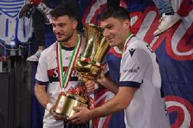 Milan vs Bologna Coppa Italia Frecciarossa - Finale Stadio Olimpico - Roma 14-05-2025 nella foto Riccardo Orsolini e Cambiaghi con la coppa ©FEDERICO GAETANO - AGENZIA ALDO LIVERANI SAS