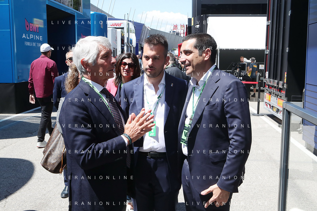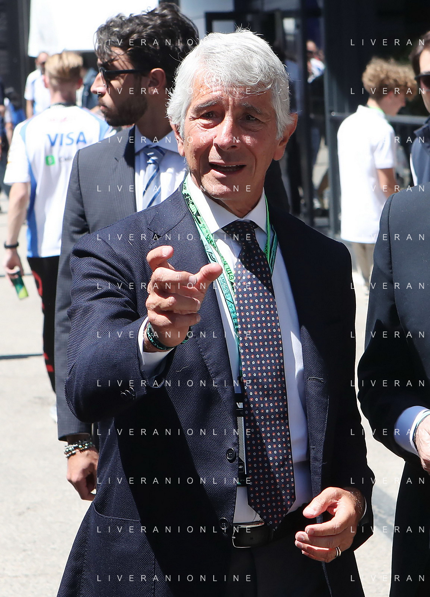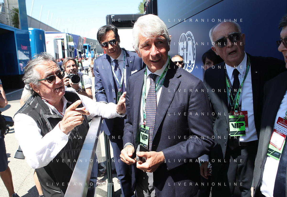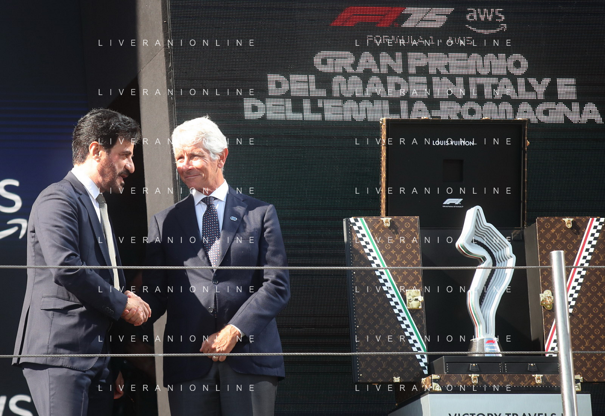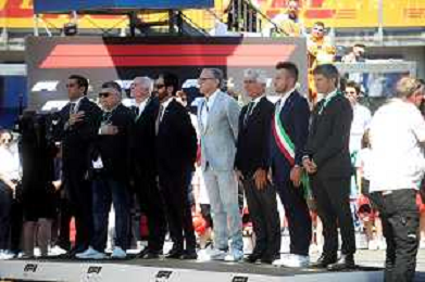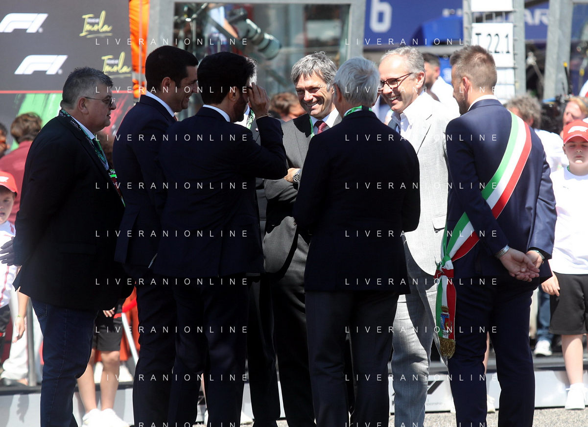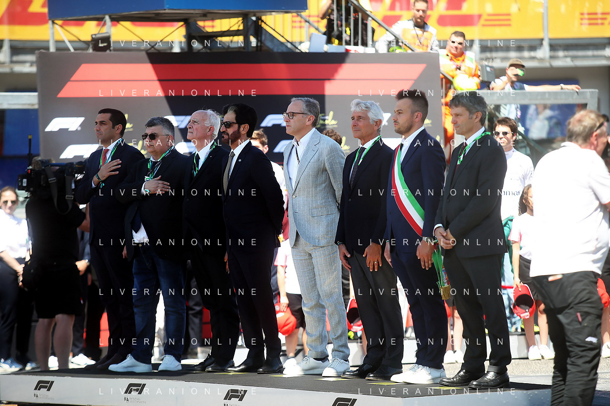 IMOLA 18 05 2025 DOMENICA AUTODROMO ENZO E DINO FERRARI DOMENICA FORMULA 1 GRAN PREMIO DEL MADE IN ITALY E DELL'EMILIA ROMAGNA - INNO NAZIONALE NELLA FOTO DA DX MATTEO ZOPPAS PRESIDENTE AGENZIA ICE, SINDACO DI IMOLA MARCO PANIERI, MINISTRO ALLO SPORT ANDREA ABODI, STEFANO DOMENICALI PRESIDENTE F1, MOHAMMED BEN SULAYEM PRESIDENTE FIA,TULLIO DEL SETTE COMMISSARIO STRAORDINARIO ACI E MICHELE DE PASCALE PRESIDENTE REGIONE EMILIA ROMAGNA ©SANNA - AGENZIA ALDO LIVERANI SAS