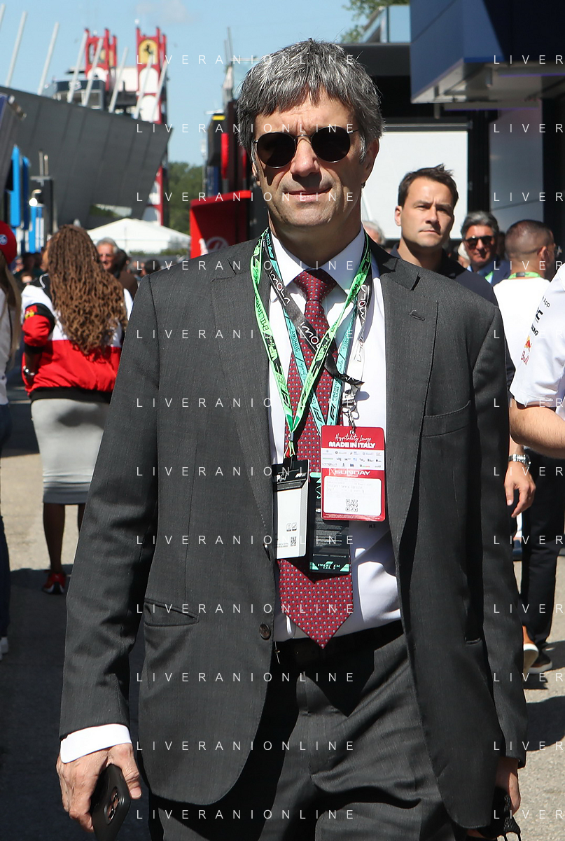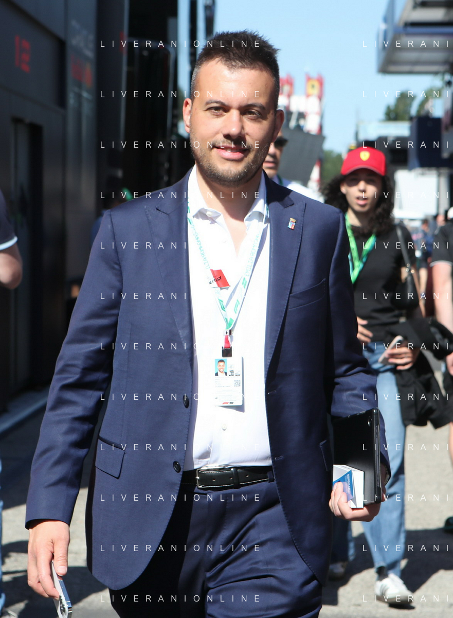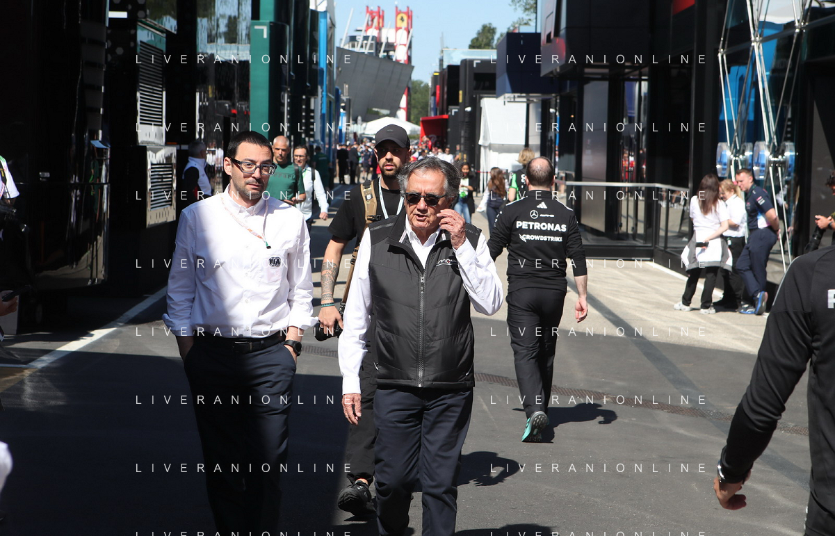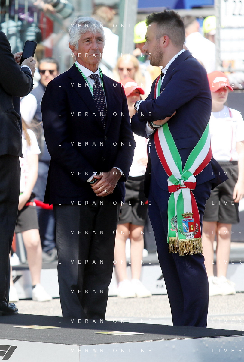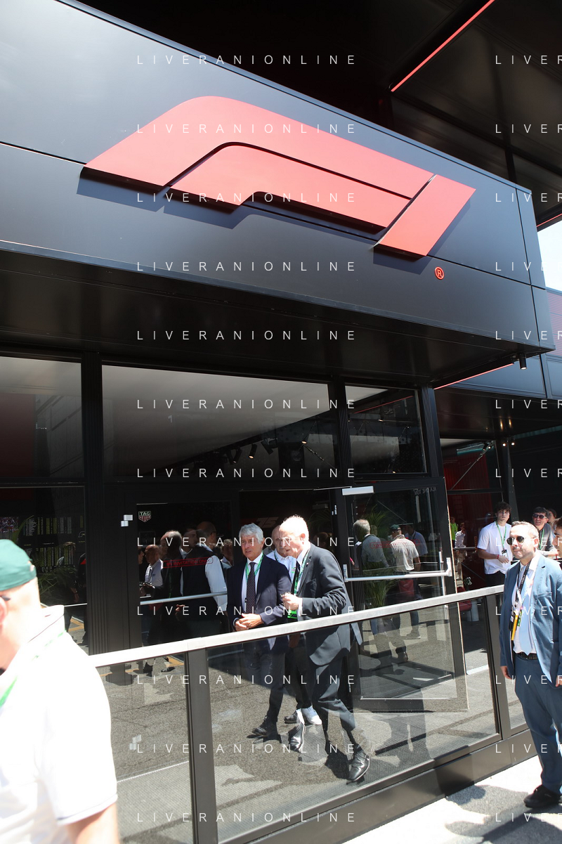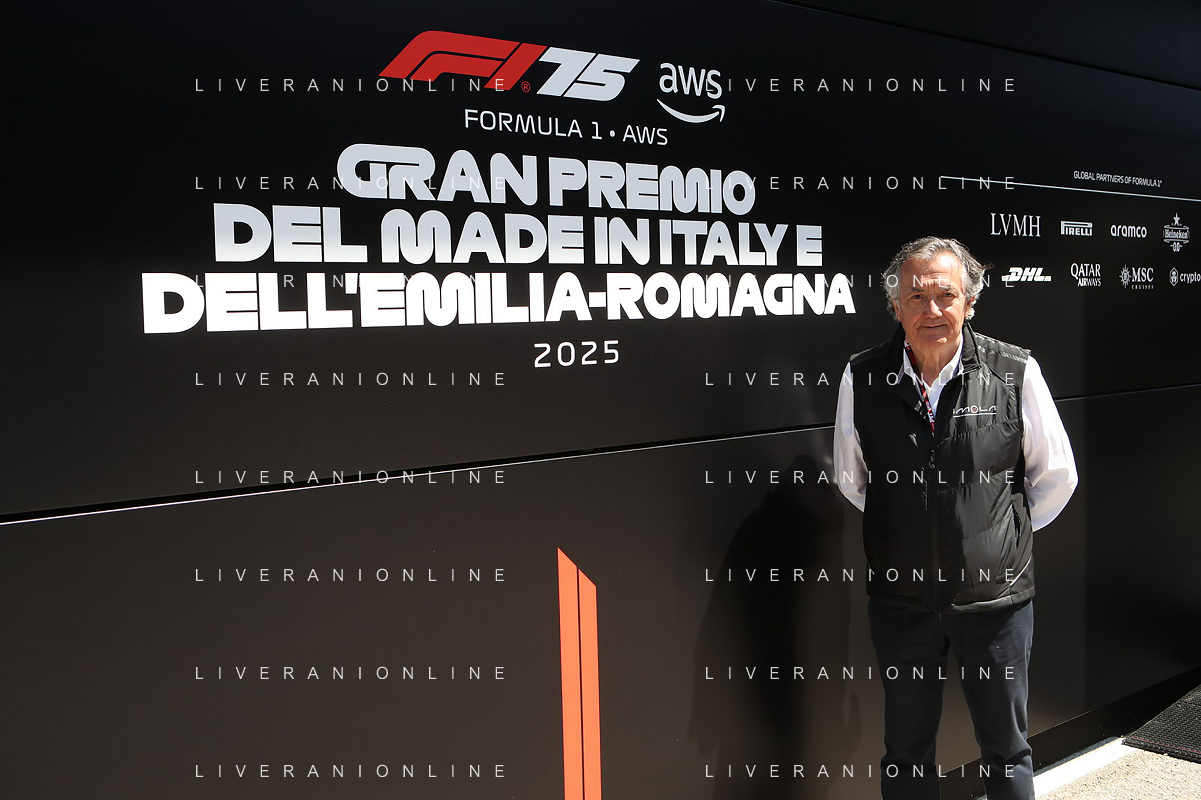 IMOLA 18 05 2025 DOMENICA AUTODROMO ENZO E DINO FERRARI DOMENICA FORMULA 1 GRAN PREMIO DEL MADE IN ITALY E DELL'EMILIA ROMAGNA - INNO NAZIONALE NELLA FOTO DA DX MATTEO ZOPPAS PRESIDENTE AGENZIA ICE, SINDACO DI IMOLA MARCO PANIERI, MINISTRO ALLO SPORT ANDREA ABODI, STEFANO DOMENICALI PRESIDENTE F1, MOHAMMED BEN SULAYEM PRESIDENTE FIA,TULLIO DEL SETTE COMMISSARIO STRAORDINARIO ACI E MICHELE DE PASCALE PRESIDENTE REGIONE EMILIA ROMAGNA ©SANNA - AGENZIA ALDO LIVERANI SAS