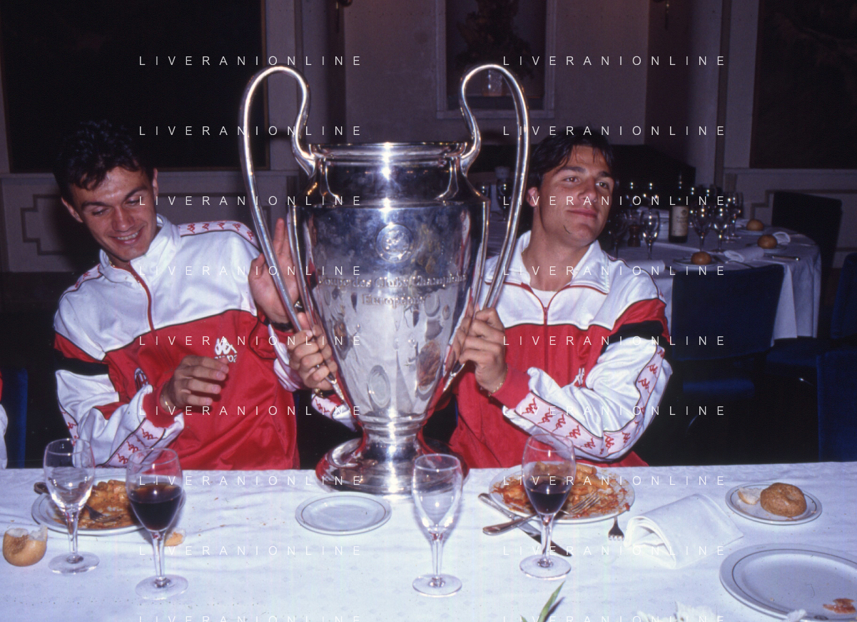 DIAP-RETROSPETTIVA CHRISTIAN LANTIGNOTTI CALCIATORE NELLA FOTO CHRISTIAN LANTIGNOTTI CON LA MAGLIA DEL MILAN NELL'ANNO 1988-1989 CON PAOLO MALDINI E LA COPPA DEI CAMPIONI AG ALDO LIVERANI SAS