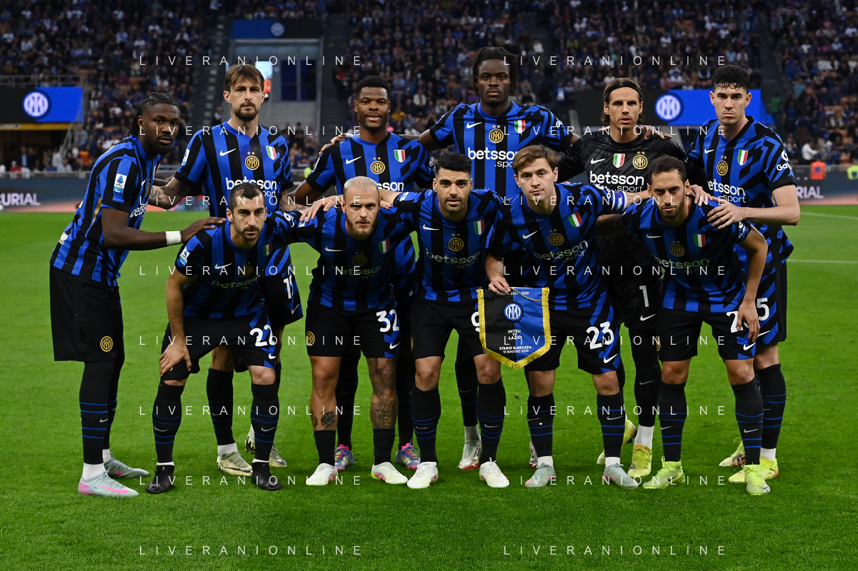 Inter vs Lazio nella foto formazione Inter, in piedi da SX Marcus Thuram, Francesco Acerbi, Denzel Dumfries, Yann Aurel Bisseck, Yann Sommer e Alessandro Bastoni; in basso da SX Henrikh Mkhitaryan, Federico Dimarco, Mehdi Taremi, Nicolò Barella e Hakan Calhanoglu Milano 18-05-2025 Stadio Giuseppe Meazza - San Siro Campionato Serie A Enilive - 37a giornata foto Roberto Garavaglia/Agenzia Aldo Liverani sas