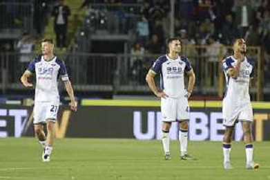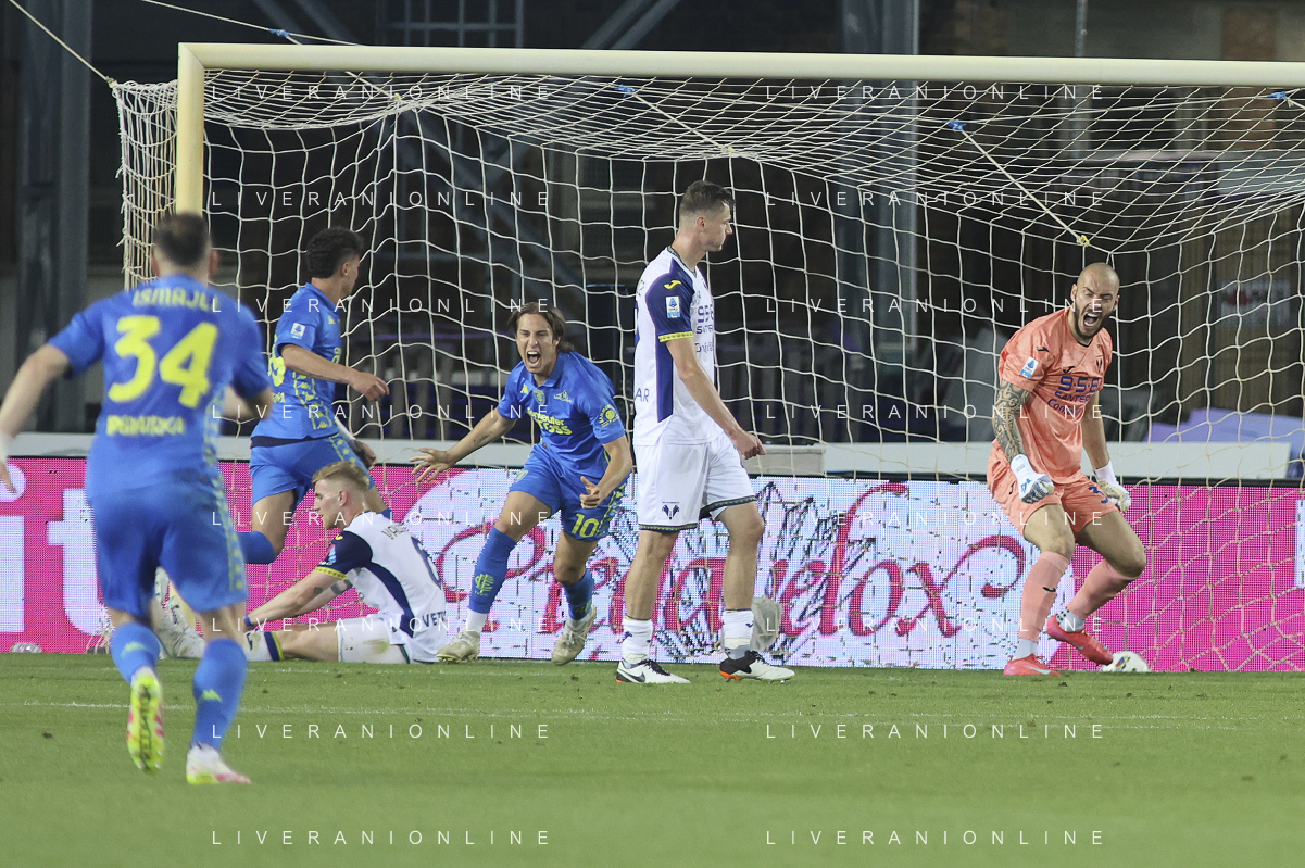 Hellas Verona players expresses disappointment after Jacopo Fazzini of Empoli FC goal during Empoli FC vs Hellas Verona FC, 38° Serie A Enilive 2024-25 game at Carlo Castellani stadium in Empoli (FI), Italy, on May 25, 2025. (Photo by Davide Casentini)- AGENZIA ALDO LIVERANI SAS