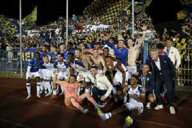 Hellas Verona team celebrate the victory at the end of Empoli FC vs Hellas Verona FC, 38° Serie A Enilive 2024-25 game at Carlo Castellani stadium in Empoli (FI), Italy, on May 25, 2025. (Photo by Davide Casentini) - AGENZIA ALDO LIVERANI SAS