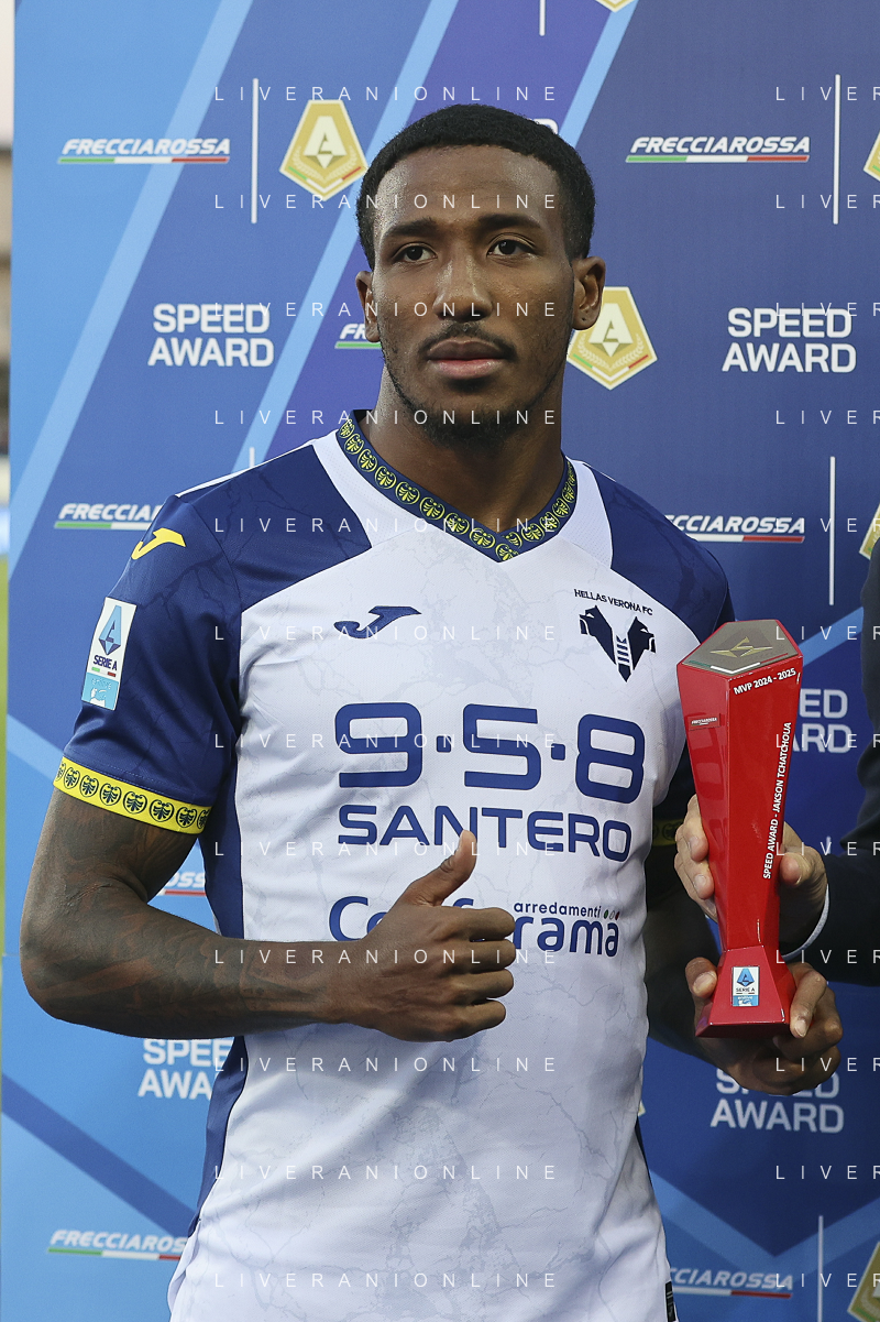 Jackson Tchatchoua of Hellas Verona FC win the speed award ofd Serie A Enilive 2025 during Empoli FC vs Hellas Verona FC, 38° Serie A Enilive 2024-25 game at Carlo Castellani stadium in Empoli (FI), Italy, on May 25, 2025. (Photo by Davide Casentini)- AGENZIA ALDO LIVERANI SAS