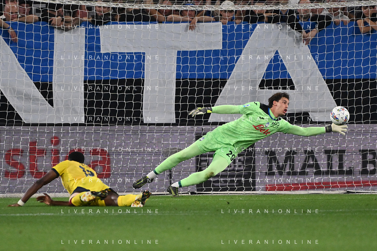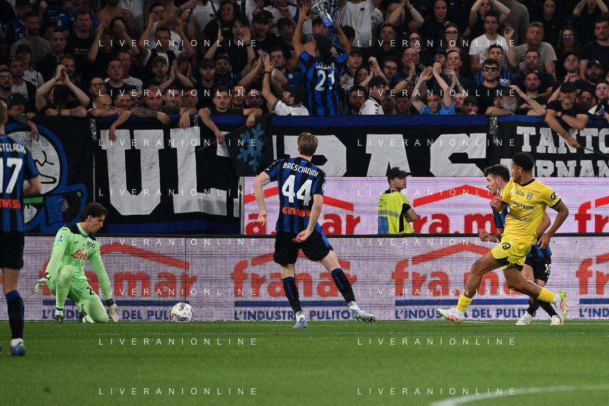 TVRG Atalanta vs Parma nella foto sullo 0 a 0 la parata di Marco Carnesecchi (Atalanta) sul colpo di testa ravvicinato di Ange-Yoan Bonny (Parma) Bergamo 25-05-2025 Gewiss Stadium Campionato Serie A Enilive - 38a giornata foto Roberto Garavaglia/Agenzia Aldo Liverani sas