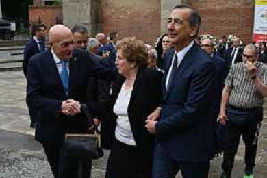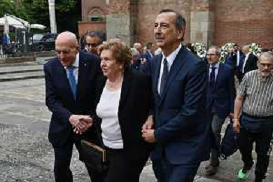 TVRG Funerale Pellegrini nella foto a signora Ivana, moglie di Ernesto Pellegrini, tra Gabriele Albertini SX e Giuseppe Sala DX Milano 04-06-2025 Funerale di Ernesto Pellegrini presso la Basilica di Sant'Ambrogio foto Roberto Garavaglia/Agenzia Aldo Liverani sas