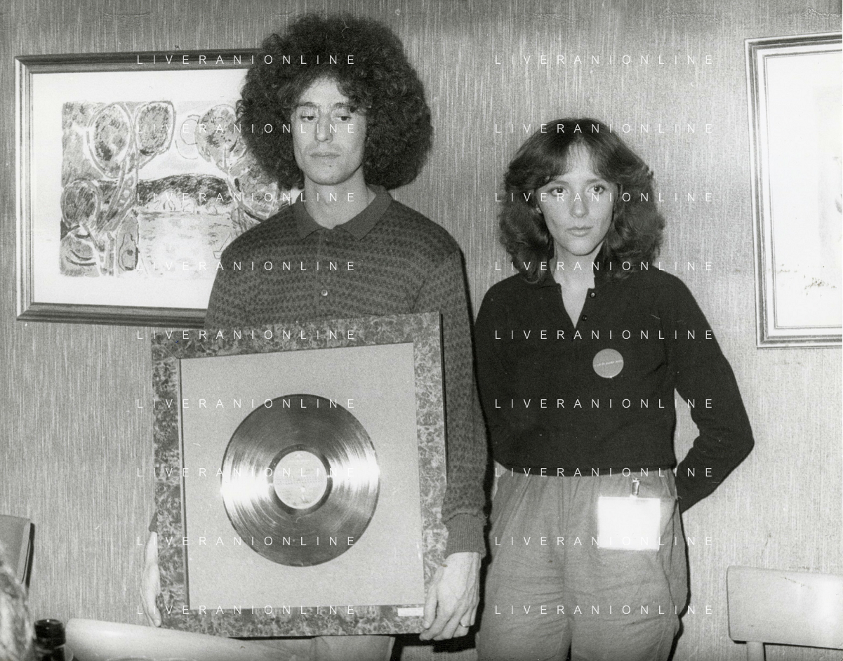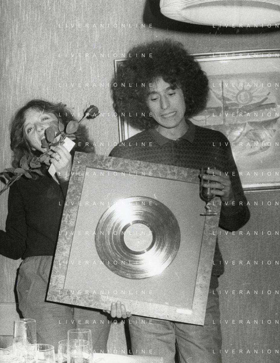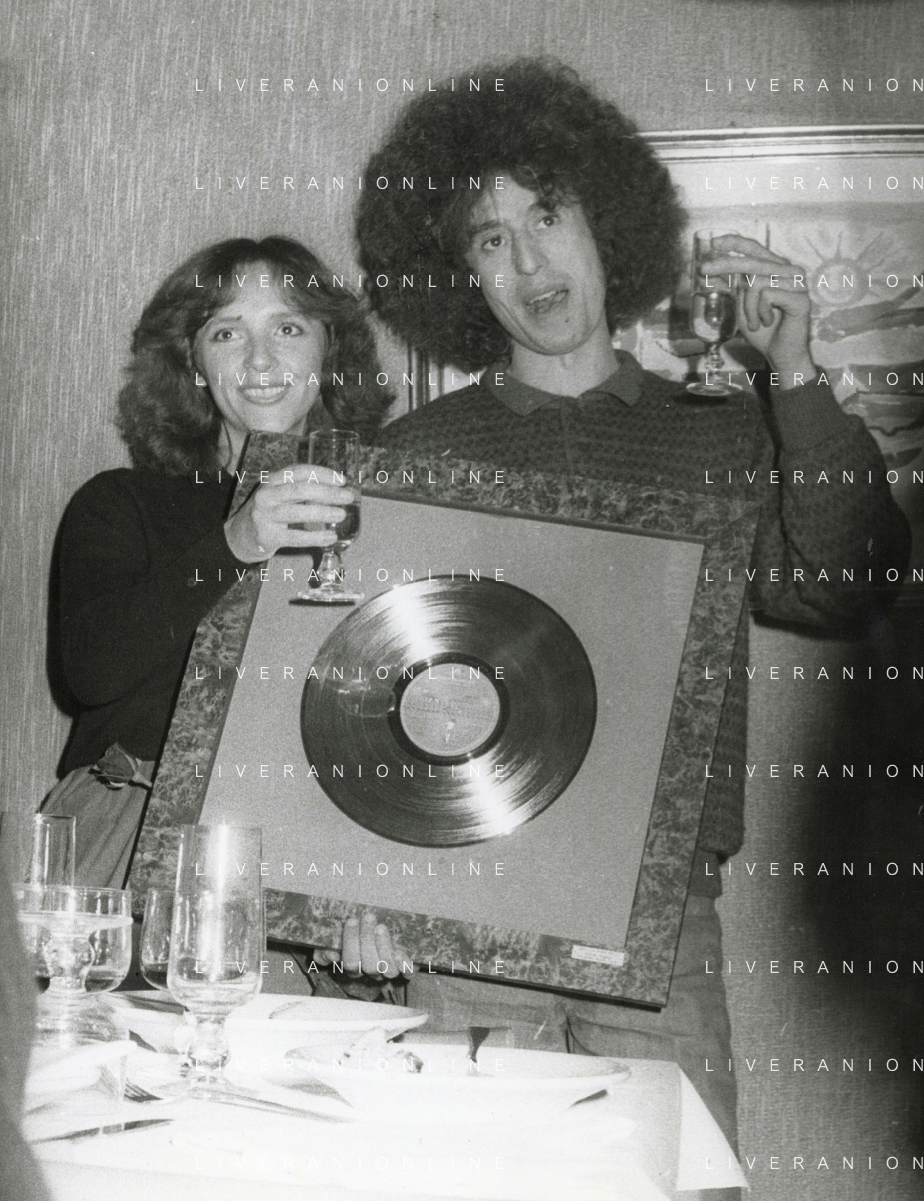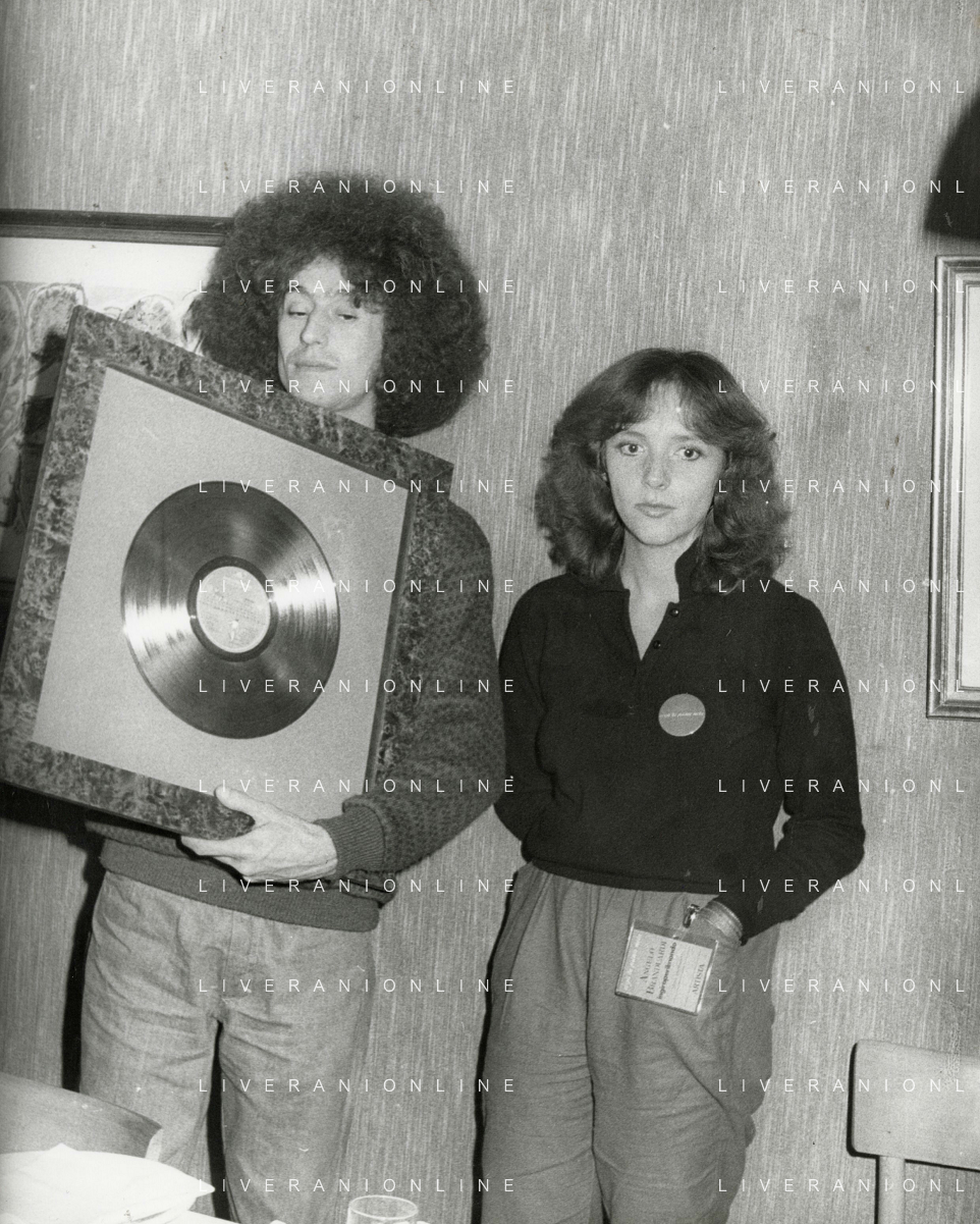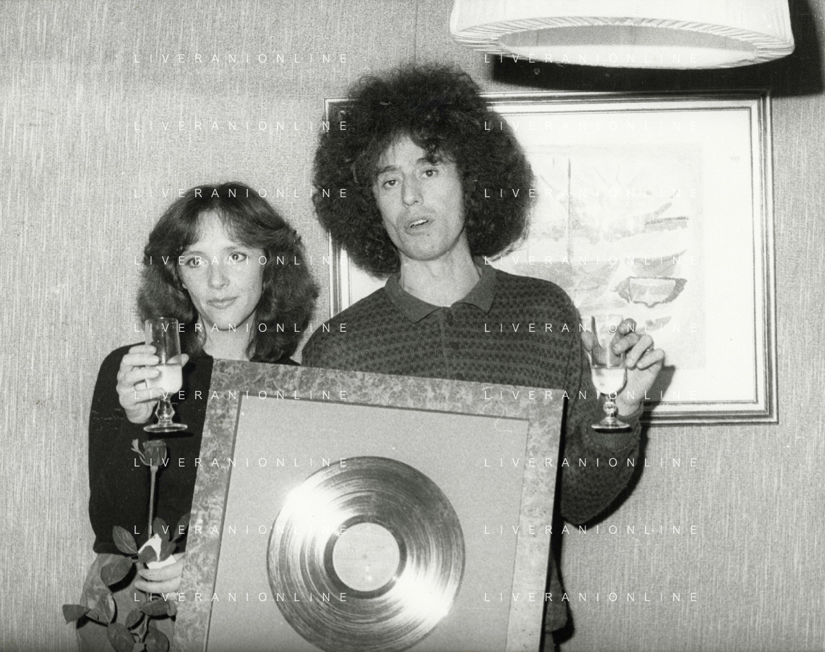 COL-RETROSPETTIVA ANGELO BRANDUARDI CANTANTE NELLA FOTO ANGELO BRANDUARDI CON LA MOGLIE COL DISCO DI PLATINO CONSEGNATO A TORINO NELL'ANNO 1979 AG ALDO LIVERANI SAS