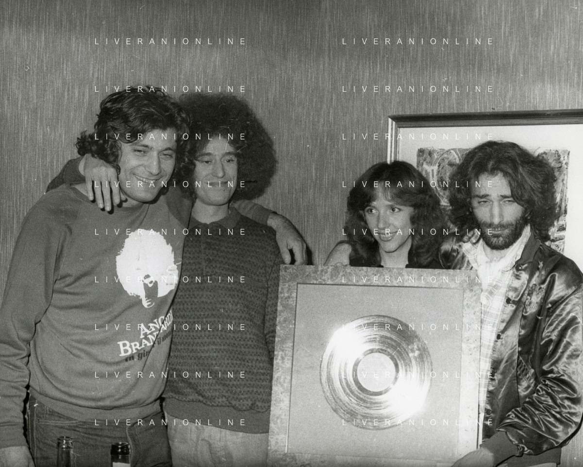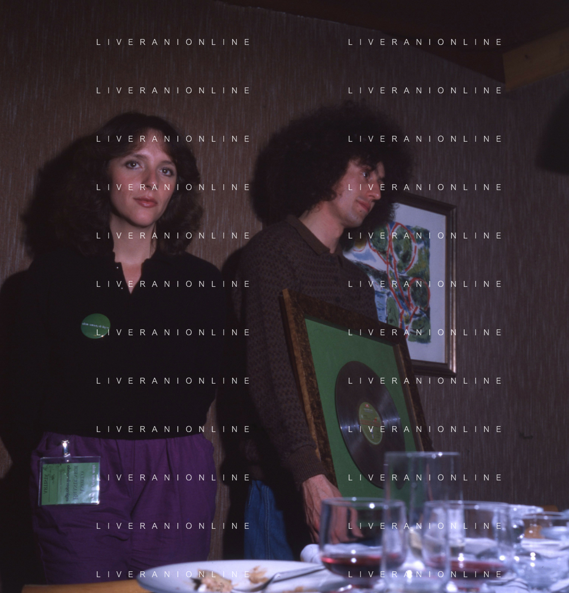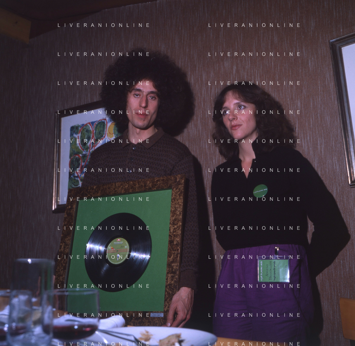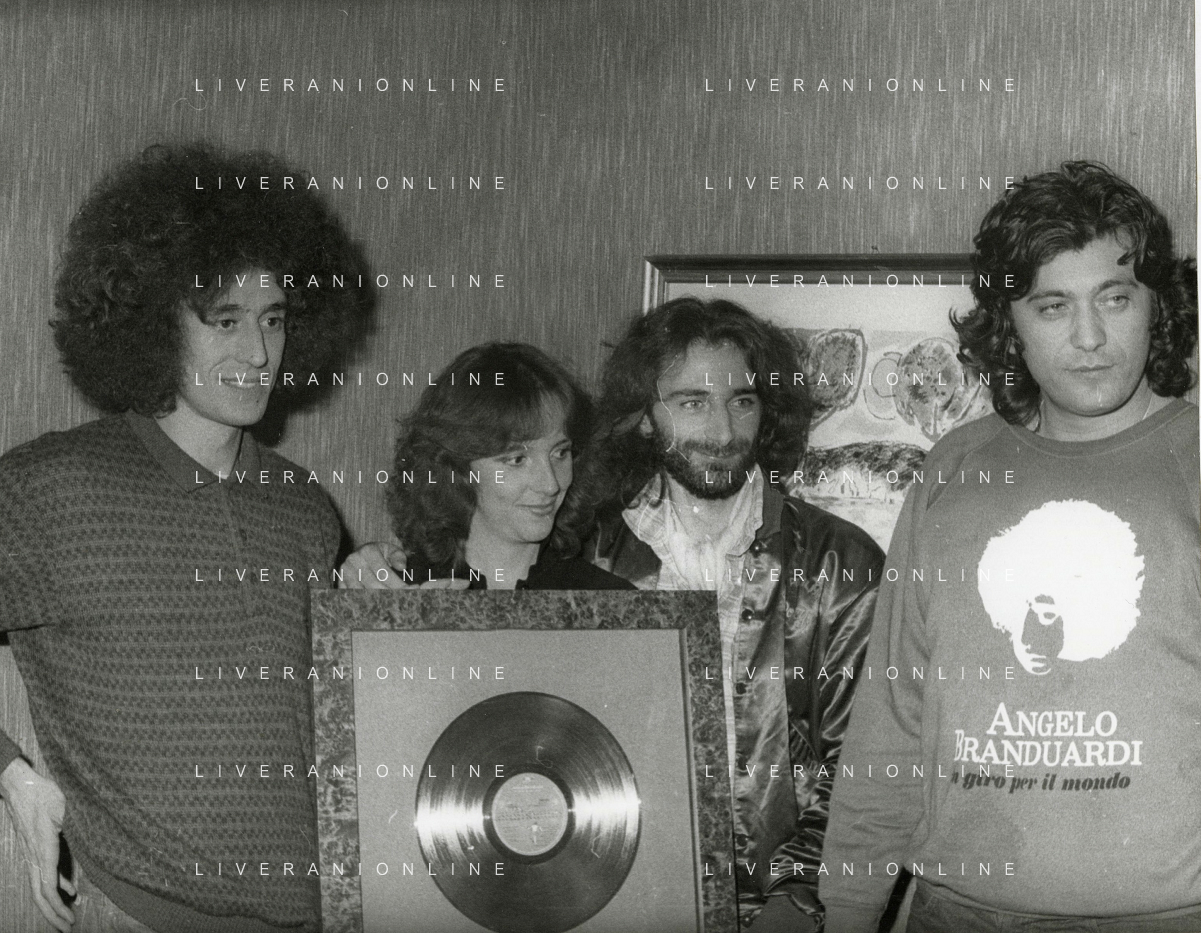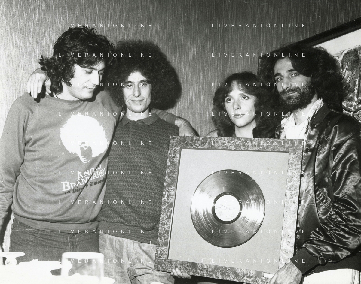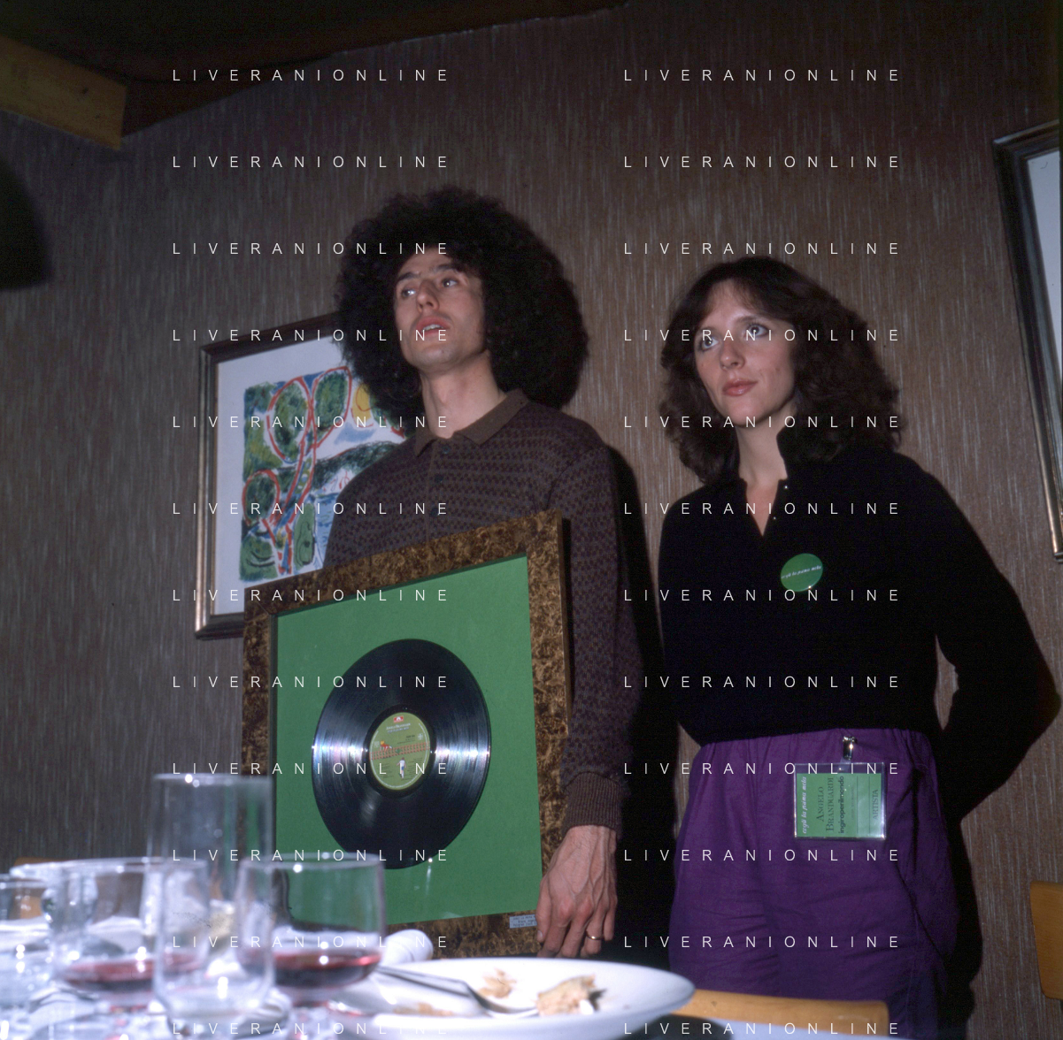 COL-RETROSPETTIVA ANGELO BRANDUARDI CANTANTE NELLA FOTO ANGELO BRANDUARDI CON LA MOGLIE COL DISCO DI PLATINO CONSEGNATO A TORINO NELL'ANNO 1979 AG ALDO LIVERANI SAS