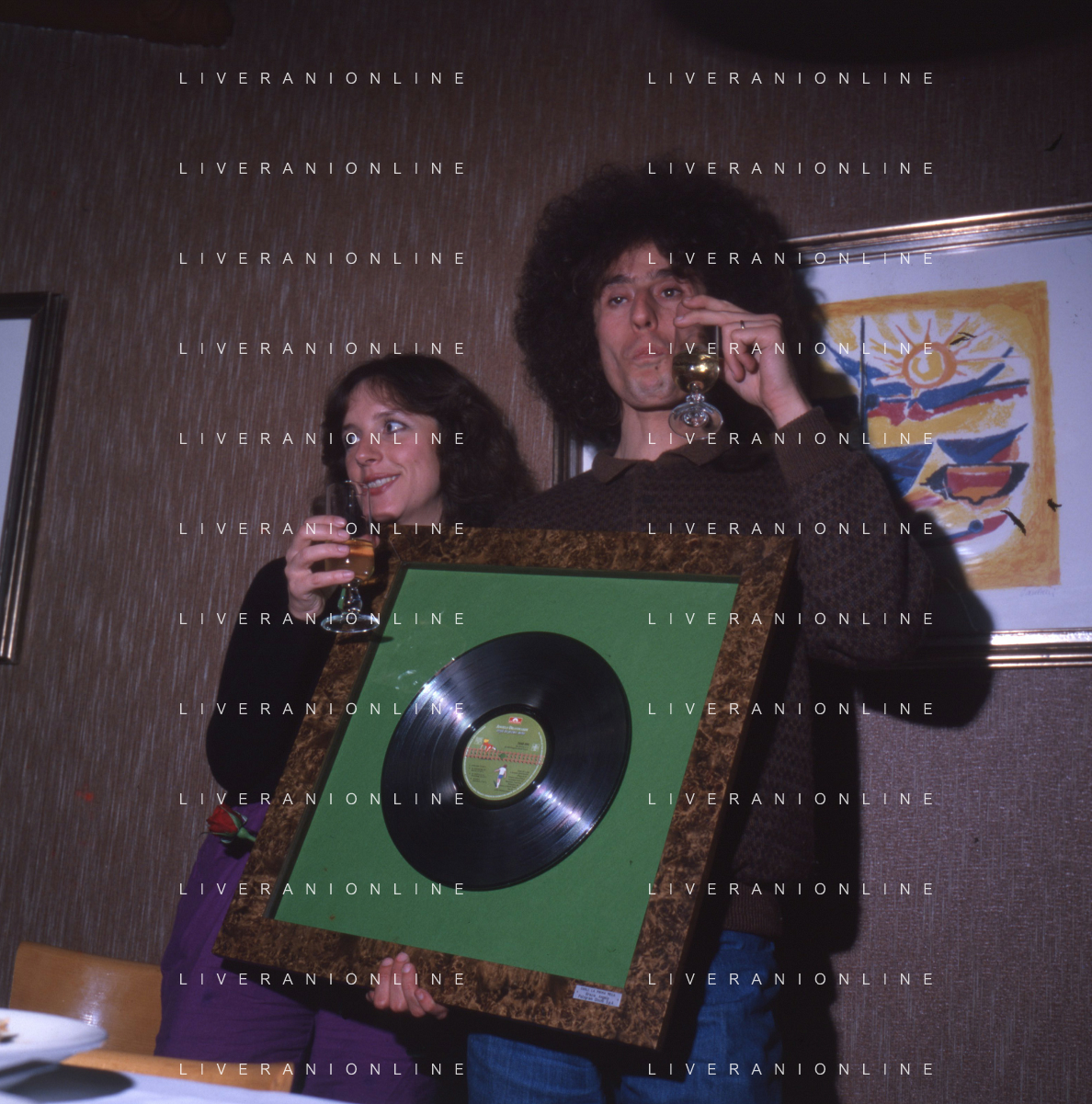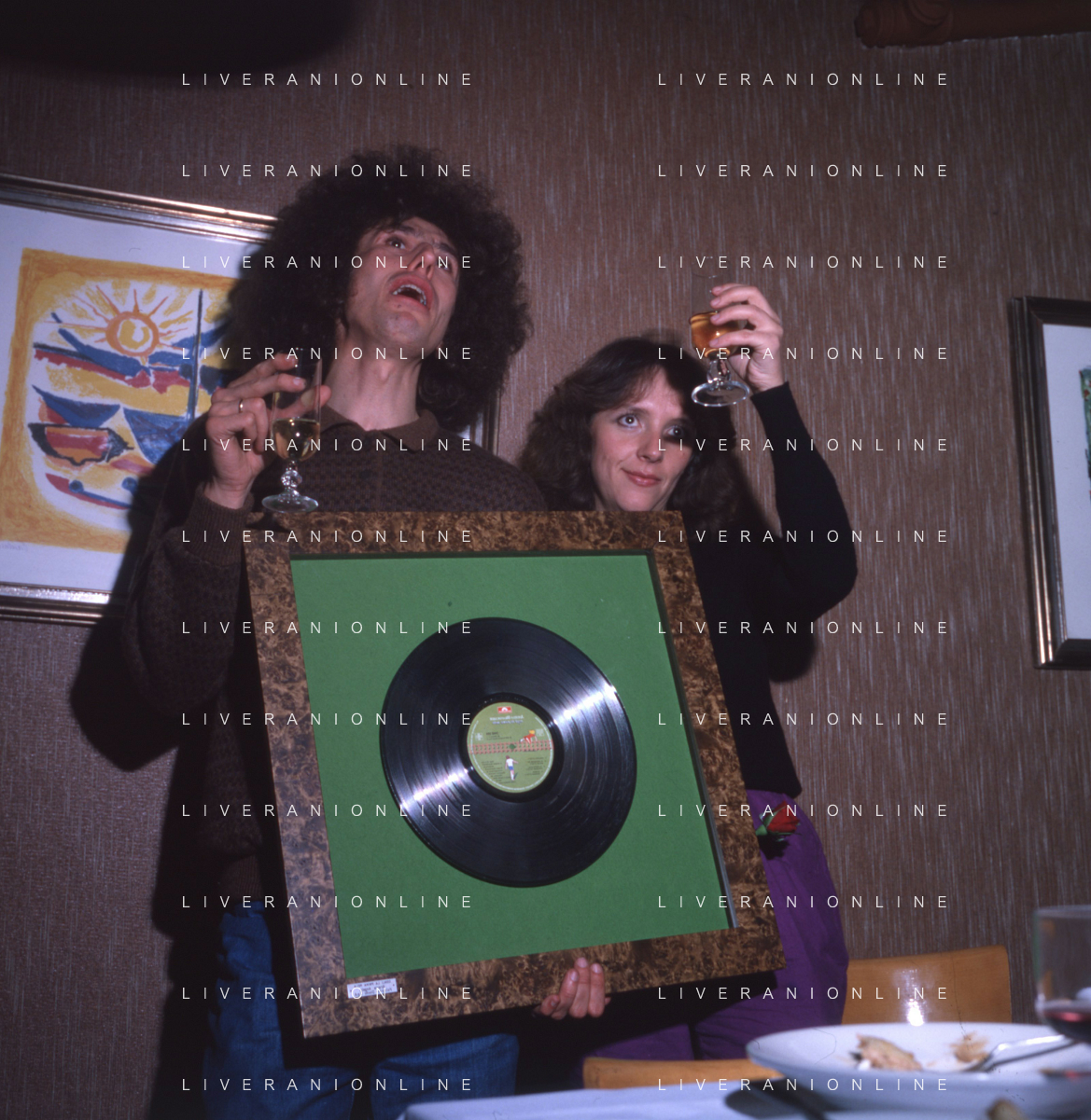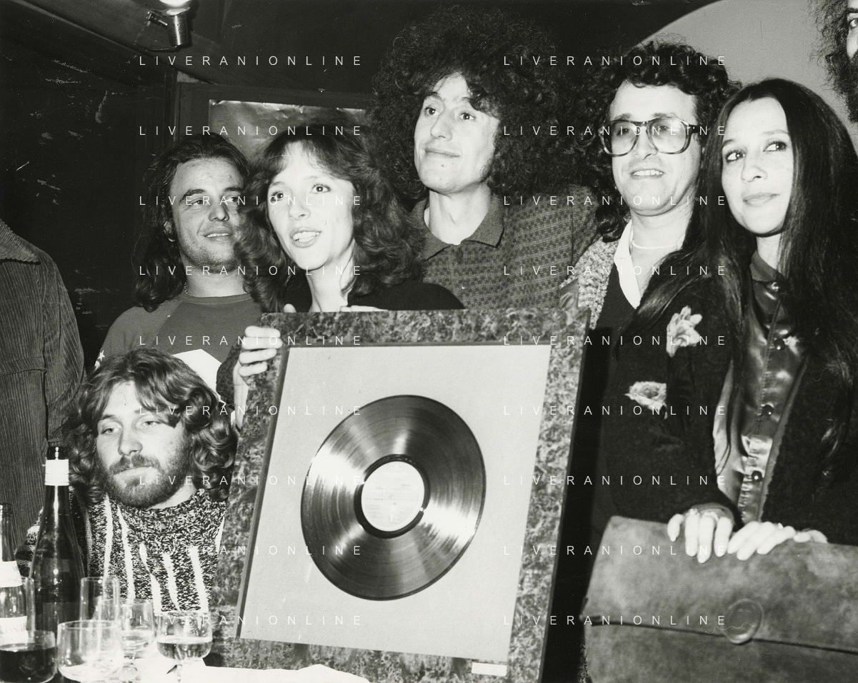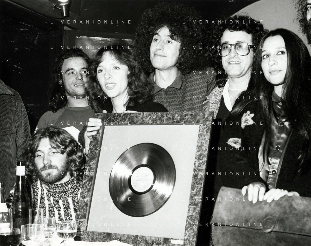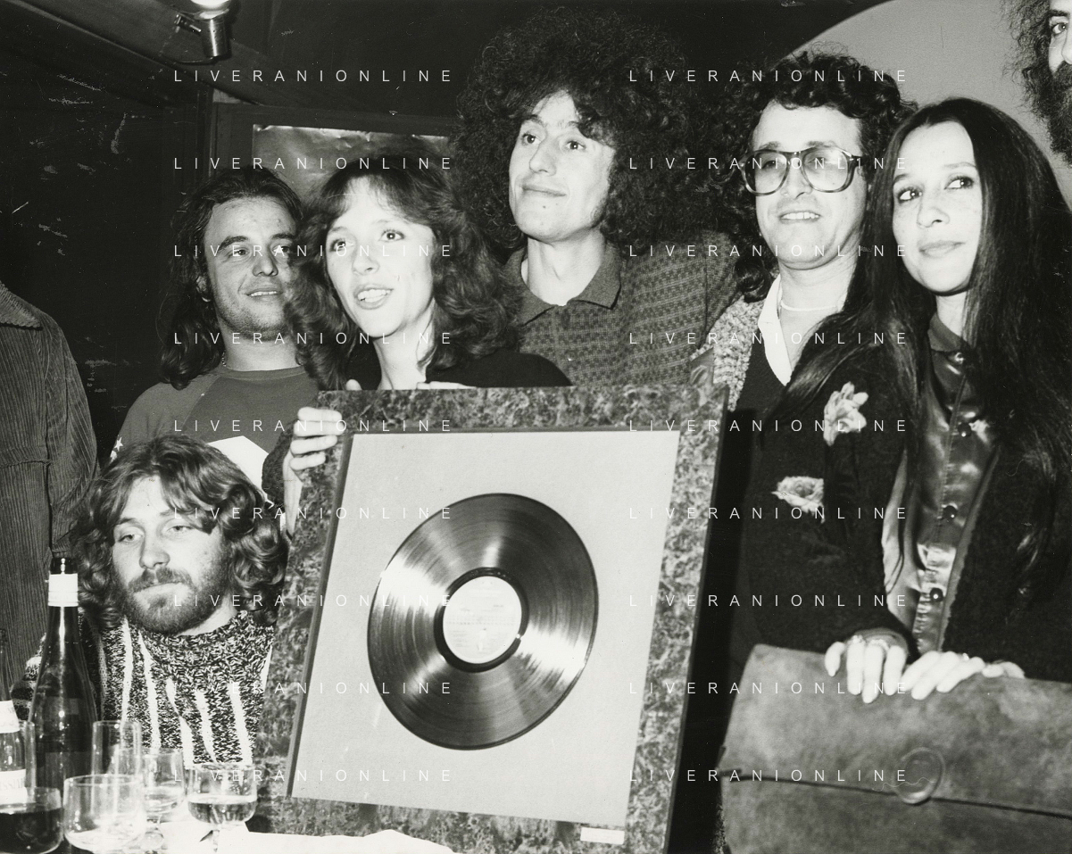 COL-RETROSPETTIVA ANGELO BRANDUARDI CANTANTE NELLA FOTO ANGELO BRANDUARDI CON LA MOGLIE COL DISCO DI PLATINO CONSEGNATO A TORINO NELL'ANNO 1979 AG ALDO LIVERANI SAS