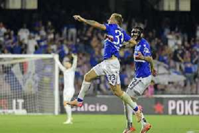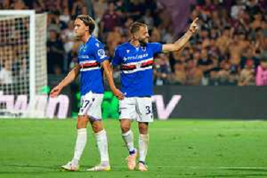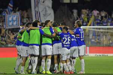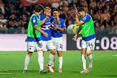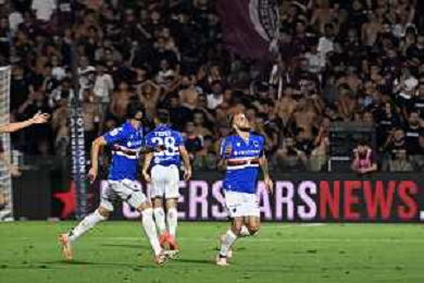 TVEM June 22, 2025 Salerno, Italy - US Salernitana 1919 vs UC Sampdoria - Italian Soccer Serie BKT Playout match 2024/25 - Arechi Stadium. In the pic: Giuseppe Sibilli of UC Sampdoria celebrates after scoring a goal with teammates ©TVEM Emmanuele Mastrodonato - AGENZIA ALDO LIVERANI SAS