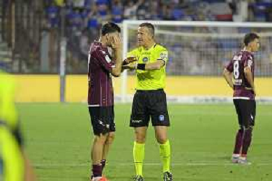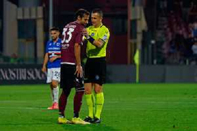 TVEM June 22, 2025 Salerno, Italy - US Salernitana 1919 vs UC Sampdoria - Italian Soccer Serie BKT Playout match 2024/25 - Arechi Stadium. In the pic: Gian Marco Ferrari of US Salernitana protests with the referee Daniele Doveri of Roma ©TVEM Emmanuele Mastrodonato - AGENZIA ALDO LIVERANI SAS