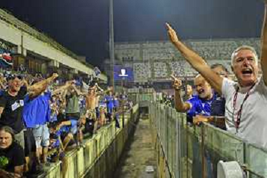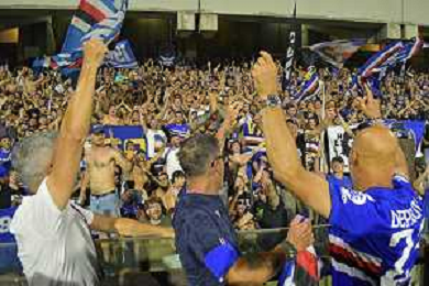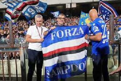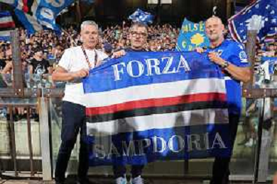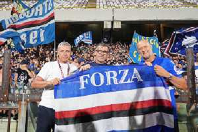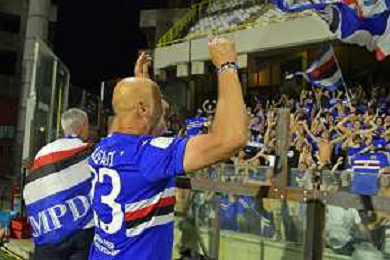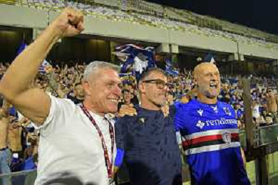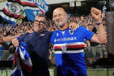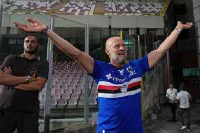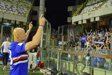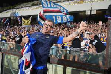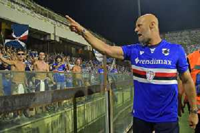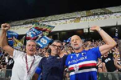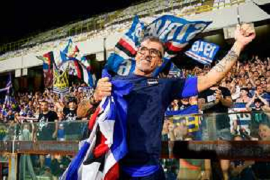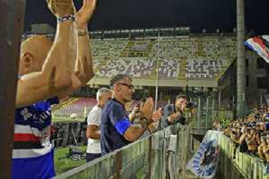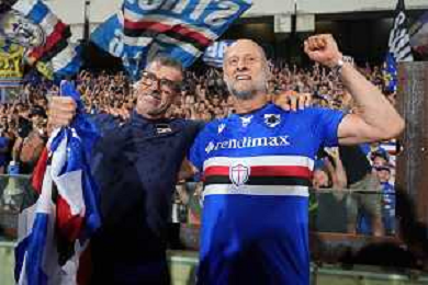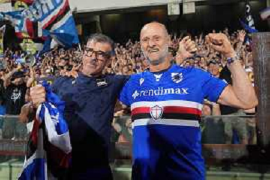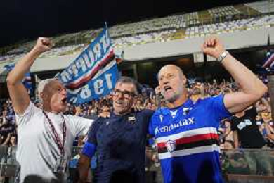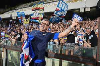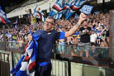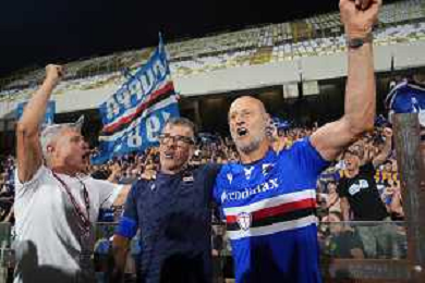 TVEM June 22, 2025 Salerno, Italy - US Salernitana 1919 vs UC Sampdoria - Italian Soccer Serie BKT Playout match 2024/25 - Arechi Stadium. In the pic: coach Alberico Evani of UC Sampdoria and Giovanni Invernizzi celebrates with Supporters of UC Sampdoria ©TVEM Emmanuele Mastrodonato - AGENZIA ALDO LIVERANI SAS