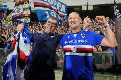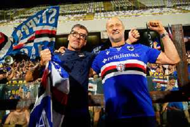 TVEM June 22, 2025 Salerno, Italy - US Salernitana 1919 vs UC Sampdoria - Italian Soccer Serie BKT Playout match 2024/25 - Arechi Stadium. In the pic: coach Alberico Evani of UC Sampdoria and Attilio Lombardo celebrates with Supporters of UC Sampdoria ©TVEM Emmanuele Mastrodonato - AGENZIA ALDO LIVERANI SAS