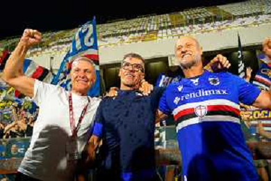 TVEM June 22, 2025 Salerno, Italy - US Salernitana 1919 vs UC Sampdoria - Italian Soccer Serie BKT Playout match 2024/25 - Arechi Stadium. In the pic: coach Alberico Evani of UC Sampdoria, Giovanni Invernizzi and Attilio Lombardo celebrates with Supporters of UC Sampdoria ©TVEM Emmanuele Mastrodonato - AGENZIA ALDO LIVERANI SAS