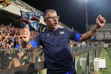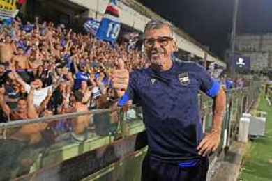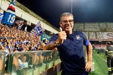 TVEM June 22, 2025 Salerno, Italy - US Salernitana 1919 vs UC Sampdoria - Italian Soccer Serie BKT Playout match 2024/25 - Arechi Stadium. In the pic: coach Alberico Evani of UC Sampdoria celebrates with Supporters of UC Sampdoria ©TVEM Emmanuele Mastrodonato - AGENZIA ALDO LIVERANI SAS