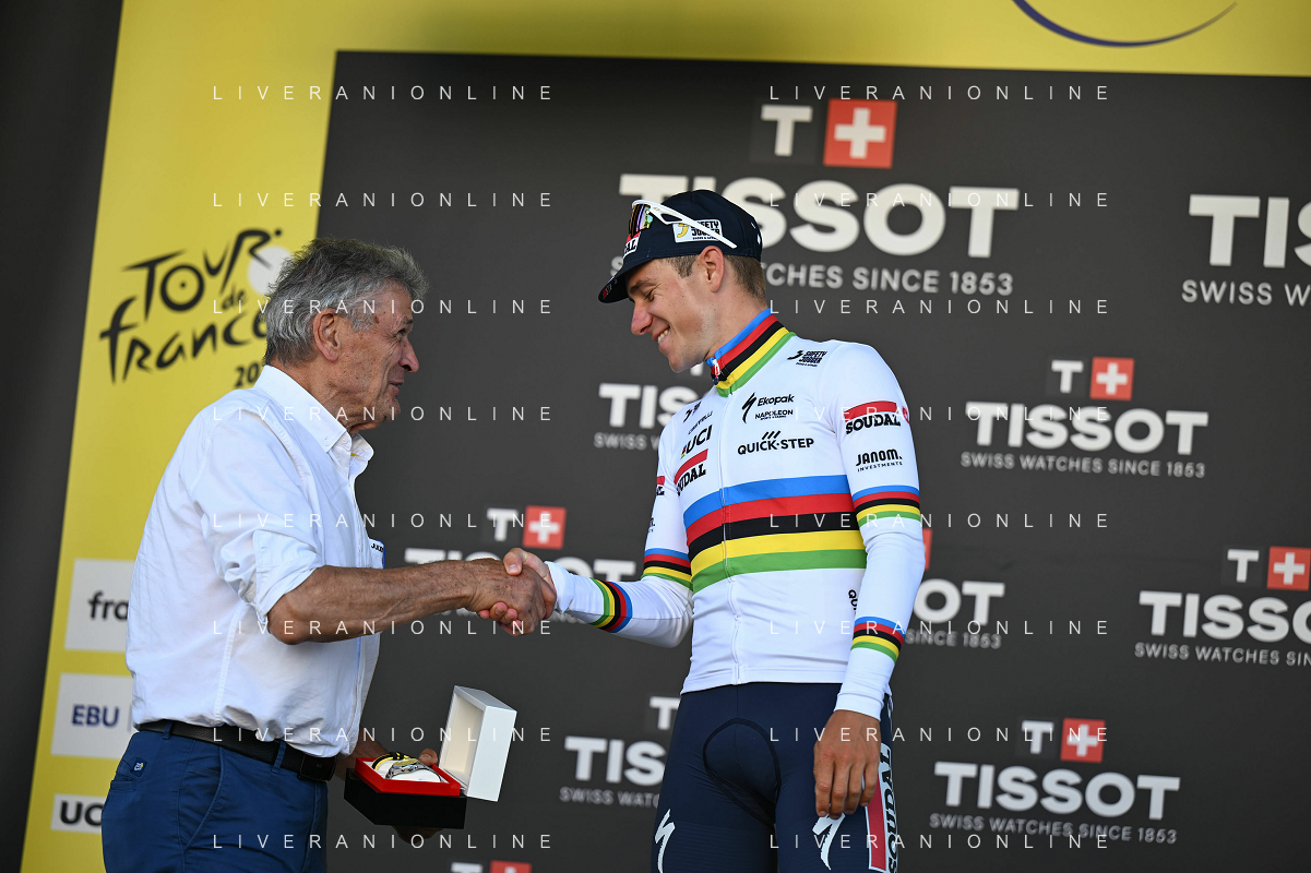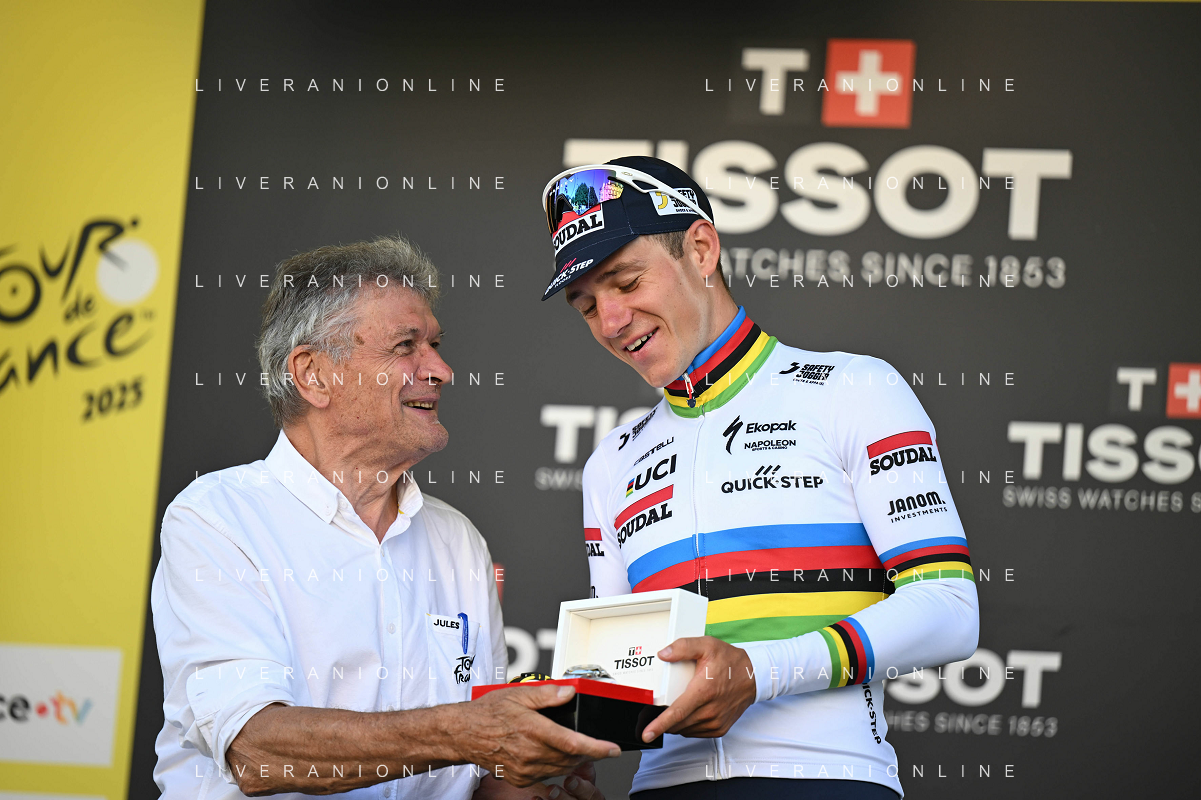 09-07-2025 Tour De France; Tappa 05 Caen - Caen; 2025, Soudal - Quick Step; Evenepoel, Remco; Thevenet, Bernard; Caen; ©SIROTTI - AGENZIA ALDO LIVERANI SAS