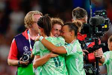 TVEM July 16, 2025 Geneva, Switzerland - Norway vs Italy - Women's UEFA Euro 2025 - Stade de Geneve. In the pic: Cristiana Girelli of Italy celebrates the victory with Barbara Bonansea of Italy and Arianna Caruso of Italy ©TVEM Emmanuele Mastrodonato - AGENZIA ALDO LIVERANI SAS