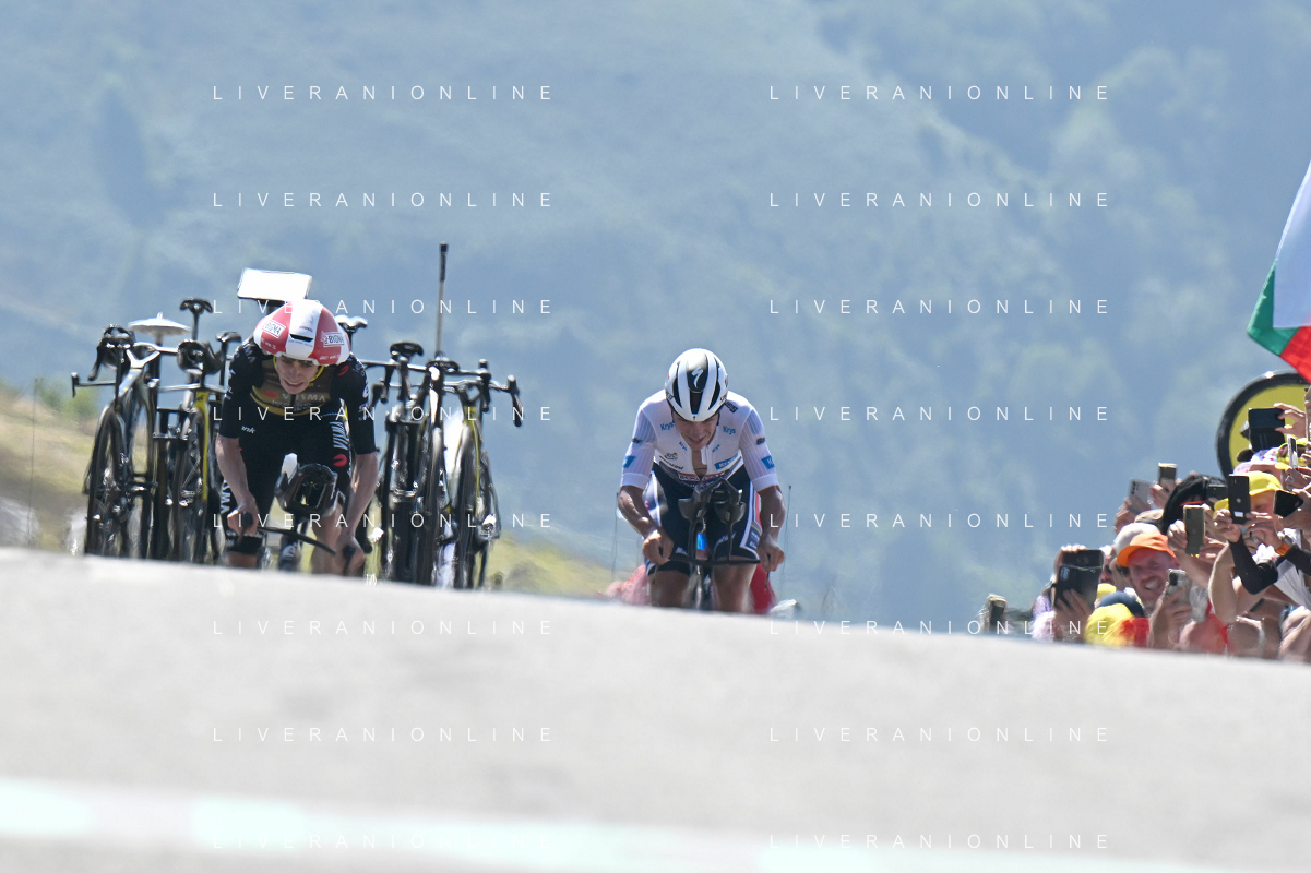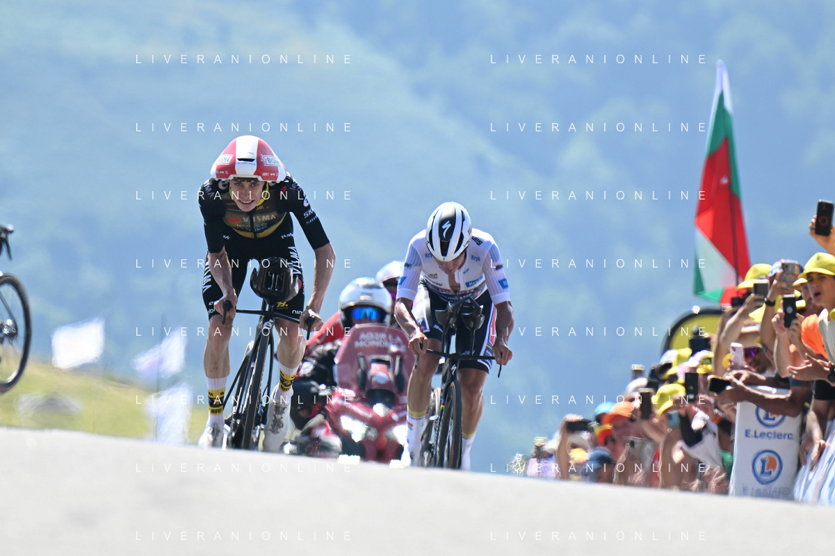 18-07-2025 Tour De France; Tappa 13 Loudenvielle - Peyragudes; 2025, Visma - Lease A Bike; 2025, Soudal - Quick Step; Vingegaard, Jonas; Evenepoel, Remco; Peyragudes; ©SIROTTI - AGENZIA ALDO LIVERANI SAS