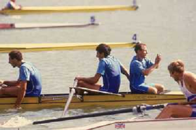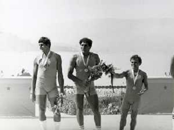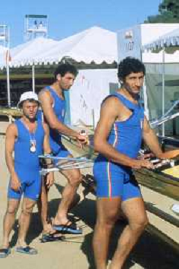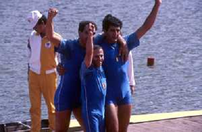 ST-RETROSPETTIVA GIUSEPPE DI CAPUA CANOA NELLA FOTO GIUSEPPE DI CAPUA NELL'ANNO 1984 CON I FRATELLI ABBAGNALE AG ALDO LIVERANI SAS