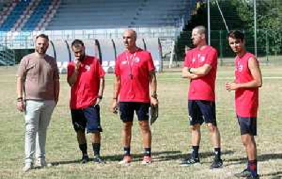 IMOLA 21 07 2025 IMOLESE CALCIO PRIMO ALLENAMENTO STAGIONE 2025/2026 NELLA FOTO PRIMO DA SINISTRA DIRETTORE GENERALE ULISE SAVINI E TERZO DA SINISTRA ALLENATORE IVAN MARCELO POTEPAN CON I SUOI COLLABORATORI ©SANNA - AGENZIA ALDO LIVERANI SAS