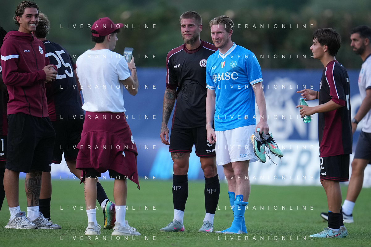 NAPOLI AREZZO AMICHEVOLE PRECAMPIONATO DIMARO 22.07.2025 NELLA FOTO: GIOCATORI DELL'AREZZO SCATTANO FOTO CON Kevin De Bruyne FOTO MOSCA/AG. ALDO LIVERANI