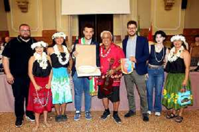 IMOLA 27 07 2025 FOLCLORE 2025 GRUPPI FOLCLORISTICI DEL MESSICO,THAILANDIA E DELLE HAWAII NELLA FOTO SINDACO MARCO PANIERI E ASSESSORE GIACOMO GAMBI CON IL GRUPPO FOLCLORISTICO DELLE HAWAII ©SANNA - AGENZIA ALDO LIVERANI SAS