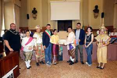 IMOLA 27 07 2025 FOLCLORE 2025 GRUPPI FOLCLORISTICI DEL MESSICO,THAILANDIA E DELLE HAWAII NELLA FOTO SINDACO MARCO PANIERI E ASSESSORE GIACOMO GAMBI CON IL GRUPPO FOLCLORISTICO DELLA THAILANDIA ©SANNA - AGENZIA ALDO LIVERANI SAS