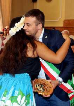 IMOLA 27 07 2025 FOLCLORE 2025 GRUPPI FOLCLORISTICI DEL MESSICO,THAILANDIA E DELLE HAWAII NELLA FOTO SINDACO MARCO PANIERI ABBRACCIO CON UNA RAGAZZA DELLE HAWAII ©SANNA - AGENZIA ALDO LIVERANI SAS