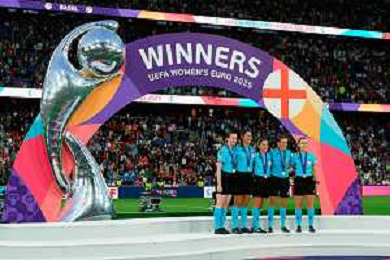 TVEM July 27, 2025 Basel, Switzerland - England vs Spain - Women's UEFA Euro 2025 Final match - St. Jakob-Park. In the pic: arbitri - Referee Stephanie Frappart poses for a photo on the podium with Assistant Referee Camille Soriano, Assistant Referee Francesca Di Monte and Fourth Official Maria Sole Ferrieri Caputi ©TVEM Emmanuele Mastrodonato - AGENZIA ALDO LIVERANI SAS