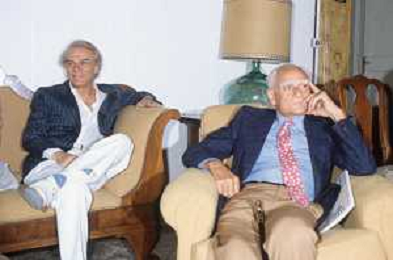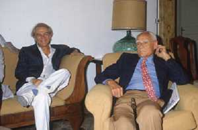 ST-RETROSPETTIVA ALBERTO MORAVIA SCRITTORE NELLA FOTO ALBERTO MORAVIA A SPOLETO NELL'ANNO 1985 CON GIORGIO ALBERTAZZI AG ALDO LIVERANI SAS
