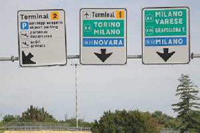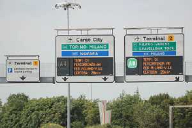 TVRCOR Traffico e cartelli all'ingresso dell'Aeroporto di Milano Malpensa (Ferno - VA) 02-08-2025 nella foto cartelli stradali Malpensa Terminal 1, Malpensa Cargo City e Malpensa Terminal 2 FOTO ROBERTA CORRADIN-AG ALDO LIVERANI SAS