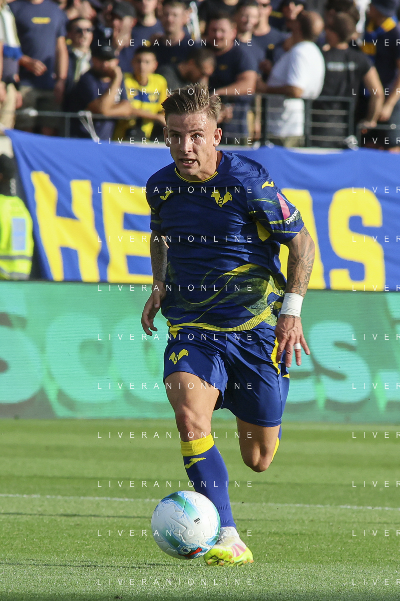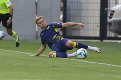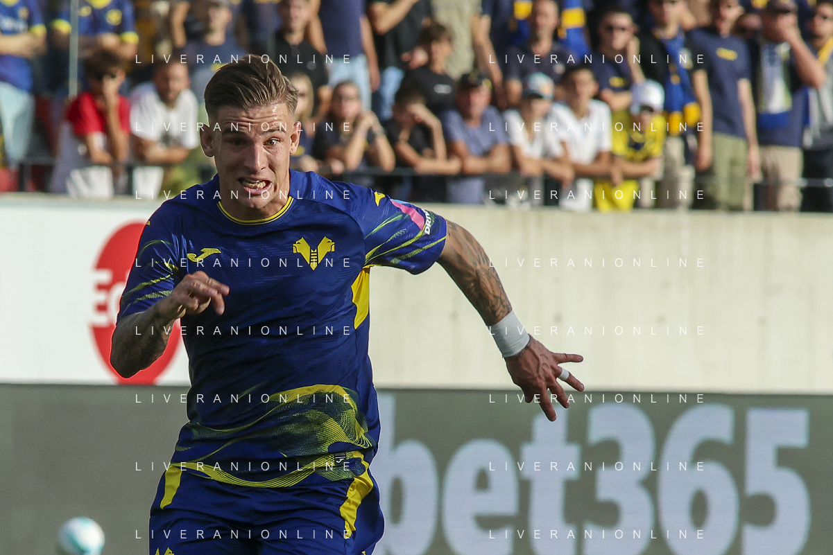 Martin Frese of Hellas Verona FC play the ball during SudTirol vs Hellas Verona FC, 4° Test Match, at Druso stadium in Bolzano (BZ), on August 03, 2025. (Photo by Davide Casentini) AG ALDO LIVERANI SAS