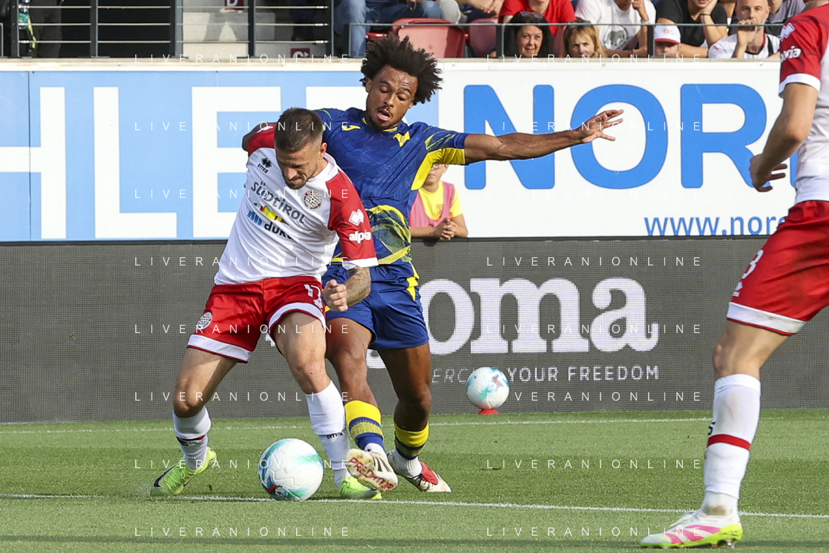 Jackson Tchatchoua of Hellas Verona FC battle for the ball with Federico Davi of FC Sudtirol during SudTirol vs Hellas Verona FC, 4° Test Match, at Druso stadium in Bolzano (BZ), on August 03, 2025. (Photo by Davide Casentini) AG ALDO LIVERANI SAS