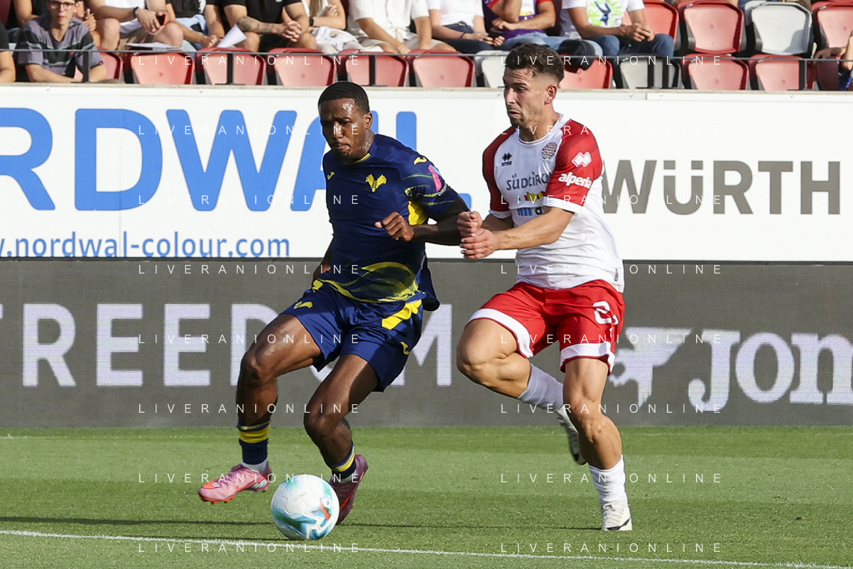 Jesus Santiago Perez of Hellas Verona FC battle for the ball with Raphael Odogwu of FC Sudtirol during SudTirol vs Hellas Verona FC, 4° Test Match, at Druso stadium in Bolzano (BZ), on August 03, 2025. (Photo by Davide Casentini) AG ALDO LIVERANI SAS