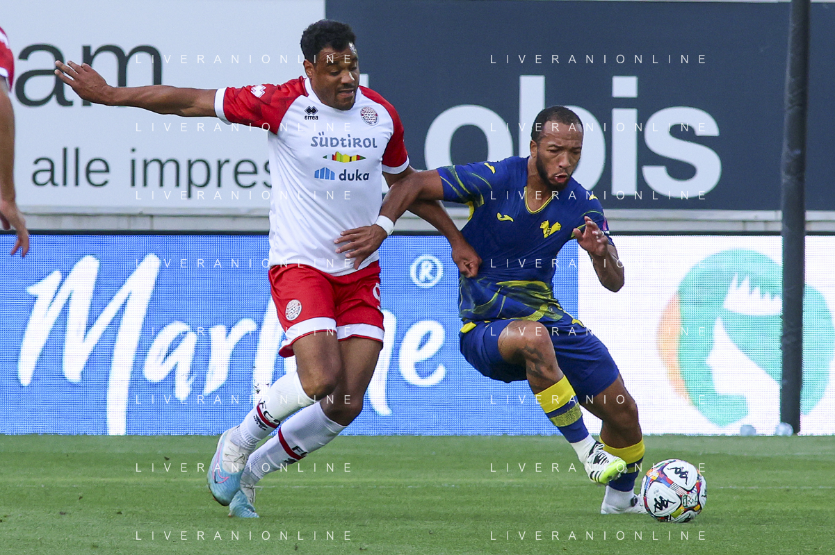 Santana do Nascimiento Giovane of Hellas Verona FC competes for the ball with Filipe Bordon of FC Sudtirol during SudTirol vs Hellas Verona FC, 4° Test Match, at Druso stadium in Bolzano (BZ), on August 03, 2025. (Photo by Davide Casentini) AG ALDO LIVERANI SAS