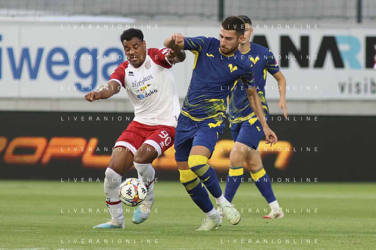 Antoine Bernède of Hellas Verona FC battle for the ball with Daniele Casiraghi of FC Sudtirol during SudTirol vs Hellas Verona FC, 4° Test Match, at Druso stadium in Bolzano (BZ), on August 03, 2025. (Photo by Davide Casentini) AG ALDO LIVERANI SAS