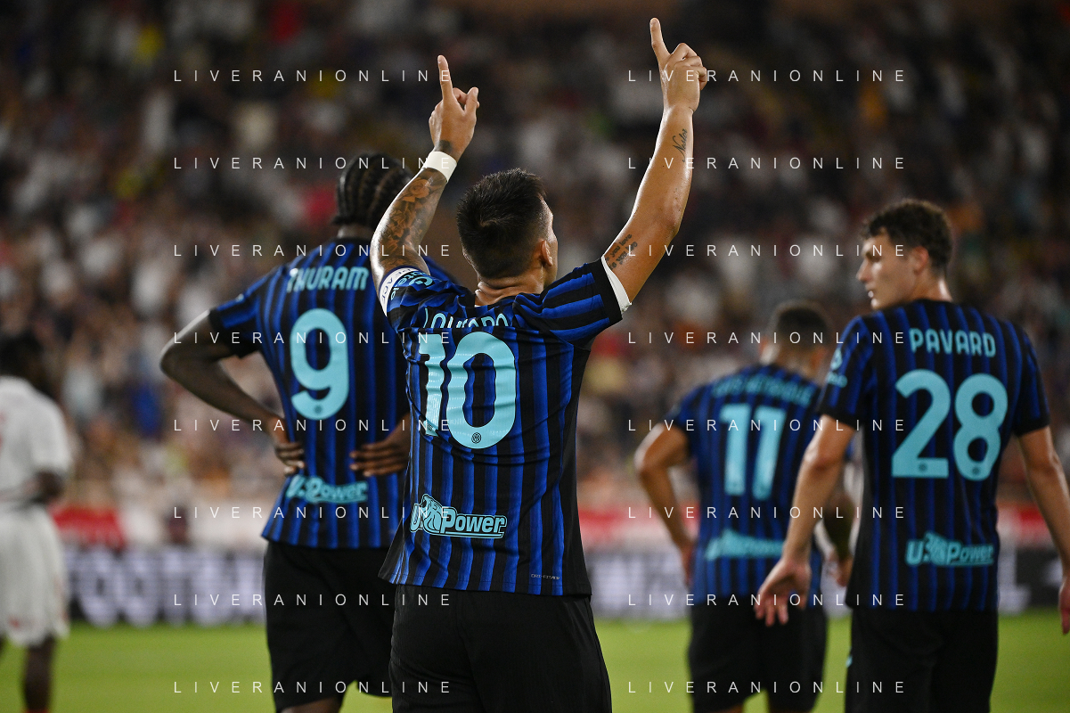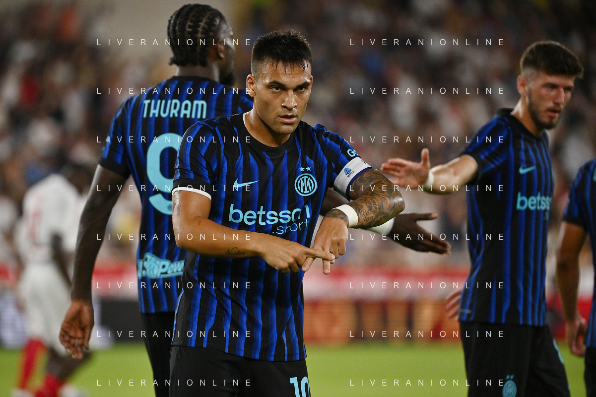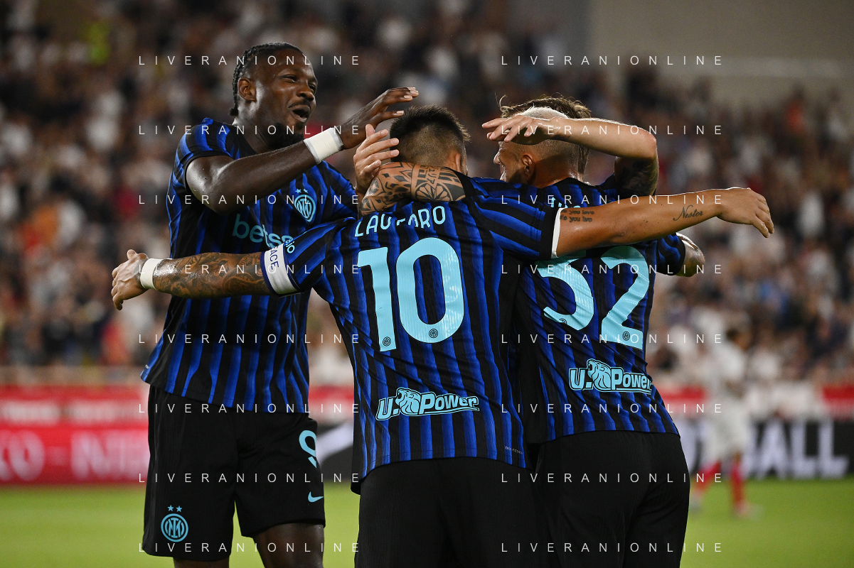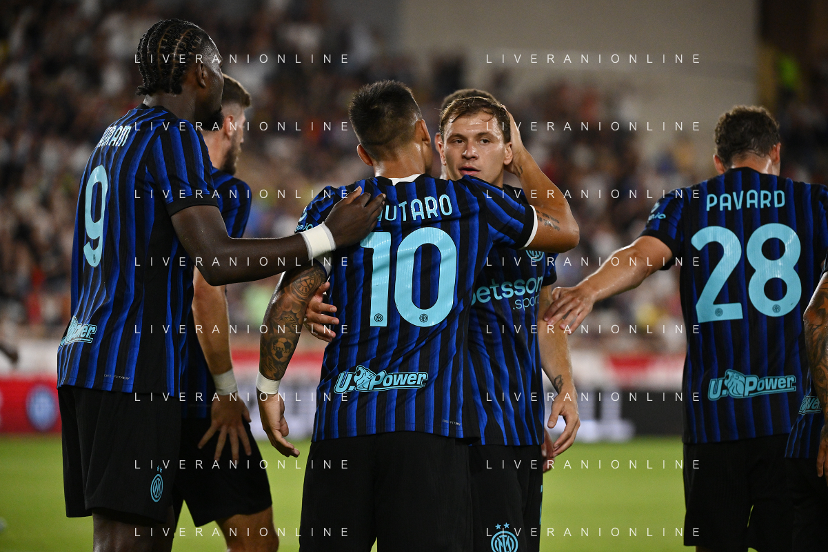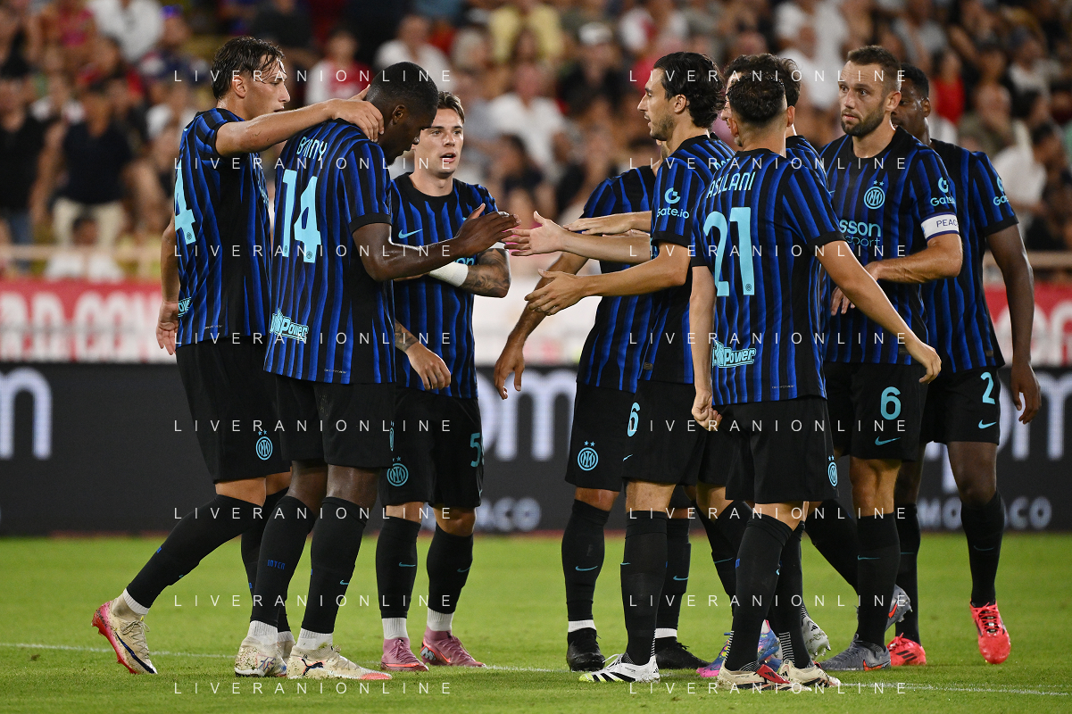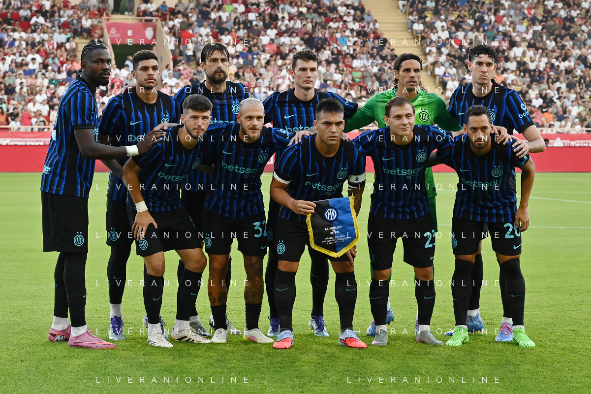 TVRG Monaco vs Inter nella foto formazione Inter, in piedi da SX Marcus Thuram (Inter), Luis Henrique de Lima (Inter), Francesco Acerbi (Inter), Benjamin Pavard (Inter), Yann Sommer (Inter) e Alessandro Bastoni (Inter); in basso da SX Petar Sucic (Inter), Federico Dimarco (Inter), Lautaro Martinez (Inter), Nicolò Barella (Inter) e Hakan Calhanoglu (Inter) Monaco (MC) 08-08-2025 Stade Louis II Monaco vs Inter - amichevole precampionato foto Roberto Garavaglia/Agenzia Aldo Liverani sas
