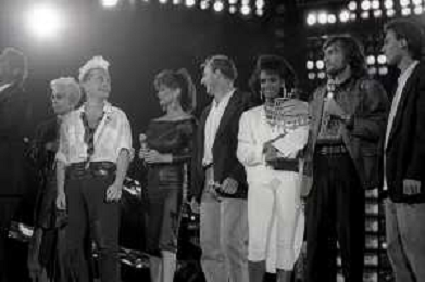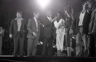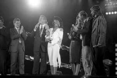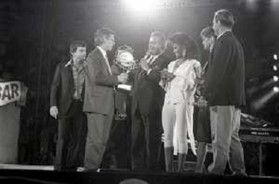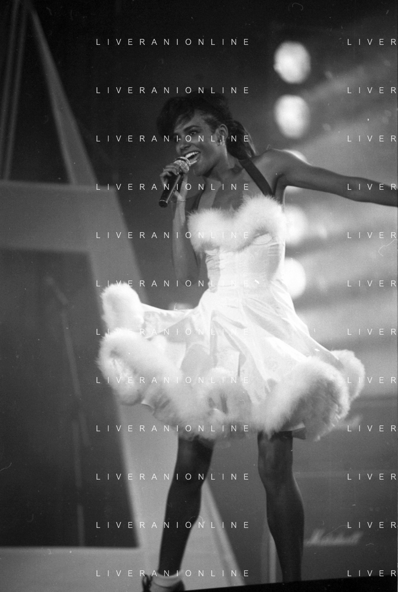 Neg - RETROSPETTIVA TRACY SPENCER CANTANTE NELLA FOTO TRACY SPENCER DURANTE LA PREMIAZIONE AL FESTIVALBAR A VERONA NELL’ANNO 1986, CON GERRY SCOTTI, CLAUDIO CECCHETTO, SUSANNA MESSAGGIO - AGENZIA ALDO LIVERANI SAS