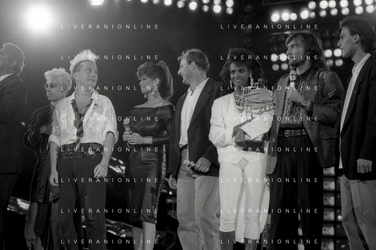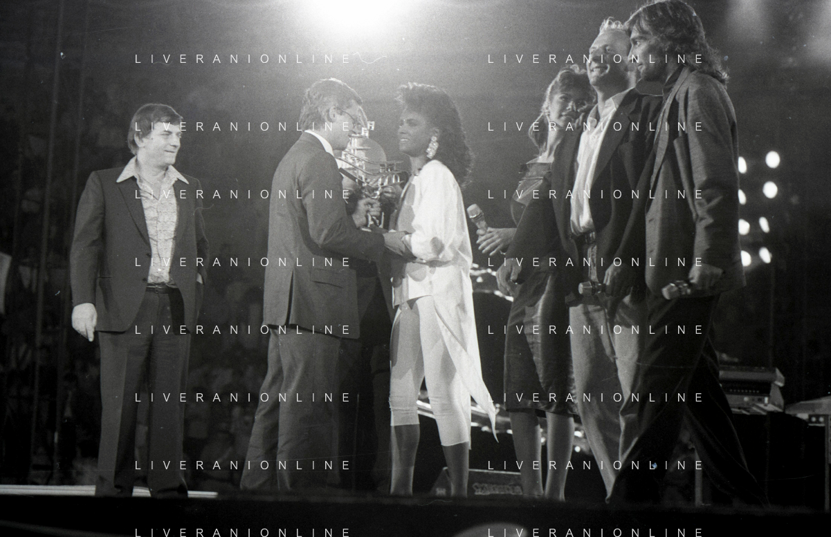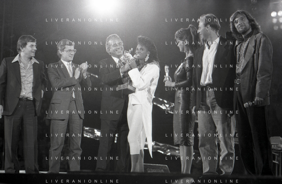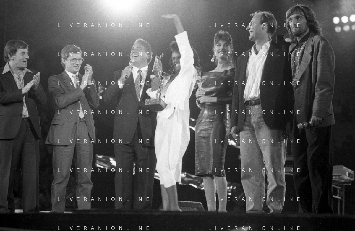 Neg - RETROSPETTIVA TRACY SPENCER CANTANTE NELLA FOTO TRACY SPENCER DURANTE LA PREMIAZIONE AL FESTIVALBAR A VERONA NELL’ANNO 1986, CON GERRY SCOTTI, CLAUDIO CECCHETTO, SUSANNA MESSAGGIO E VITTORIO SALVETTI - AGENZIA ALDO LIVERANI SAS