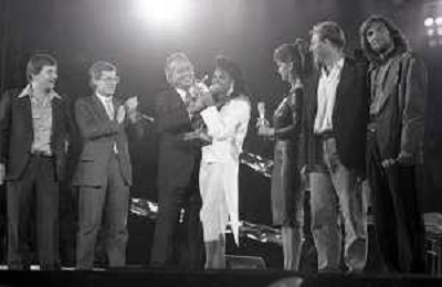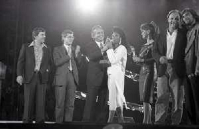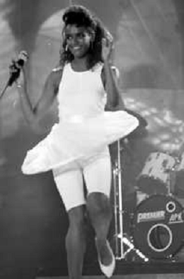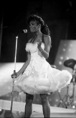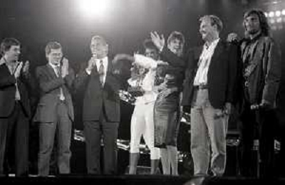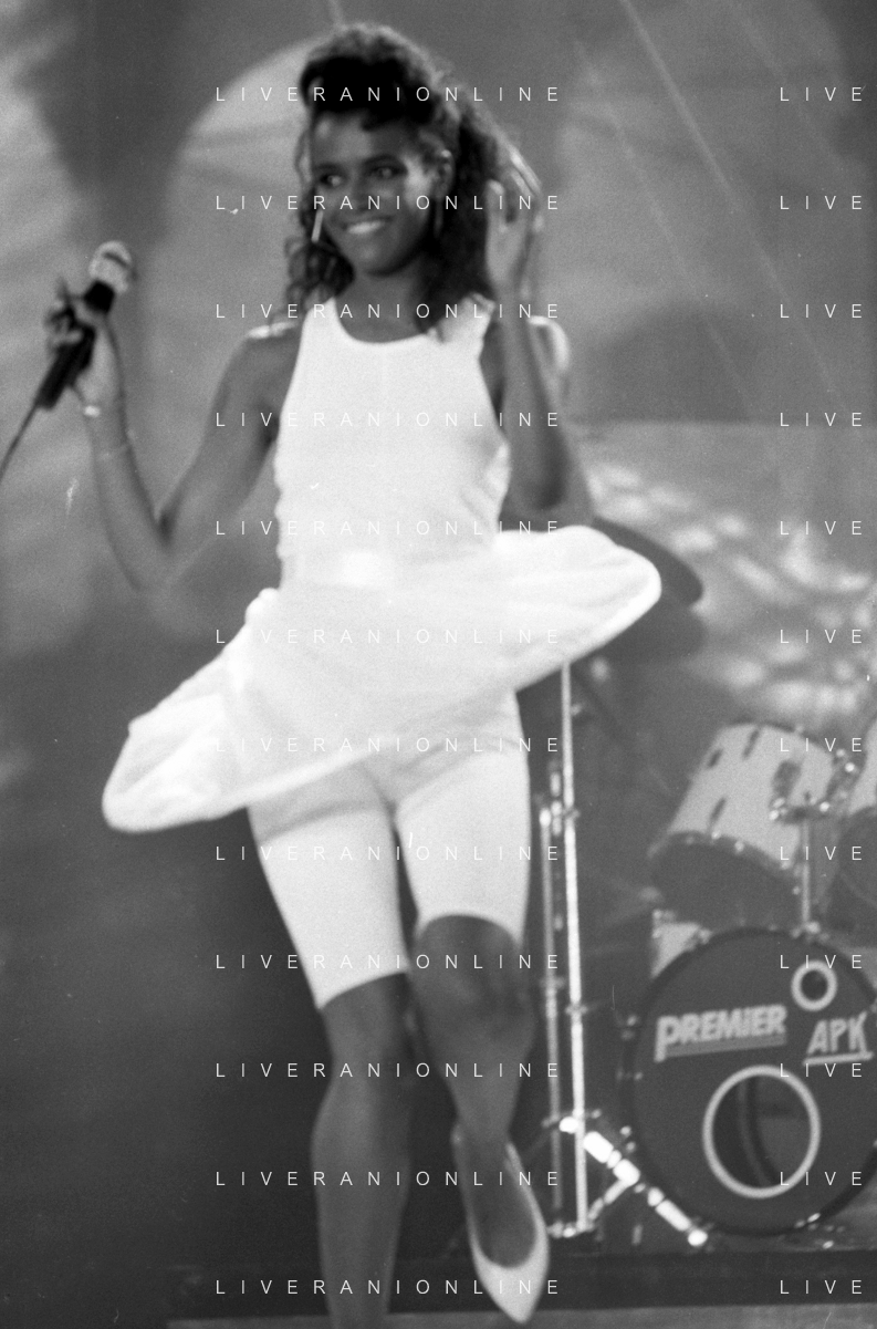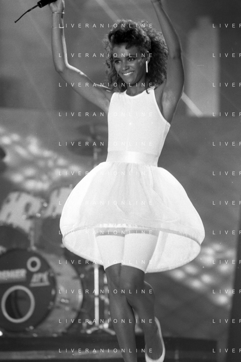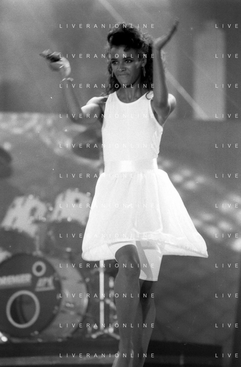 Neg - RETROSPETTIVA TRACY SPENCER CANTANTE NELLA FOTO TRACY SPENCER DURANTE LA PREMIAZIONE AL FESTIVALBAR A VERONA NELL’ANNO 1986, CON GERRY SCOTTI, CLAUDIO CECCHETTO, SUSANNA MESSAGGIO E VITTORIO SALVETTI - AGENZIA ALDO LIVERANI SAS